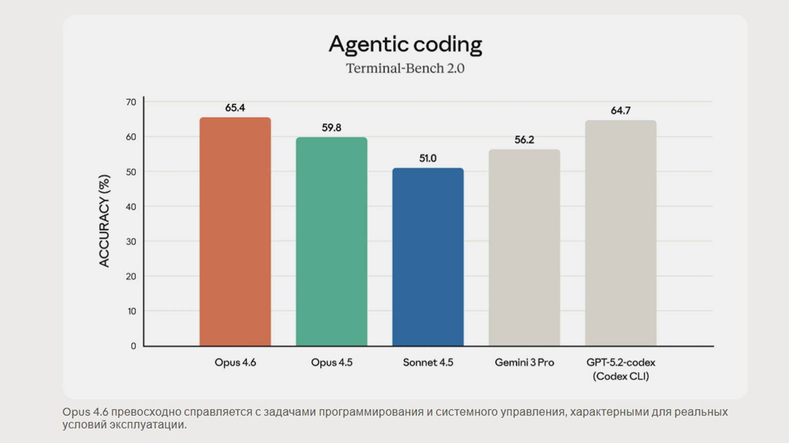 Opus 4.6 заняла первое место в нескольких бенчмарках для агентных задач. Модель показала наивысший результат в тесте на агентное кодирование Terminal-Bench 2.0 и опередила все передовые модели в Humanity’s Last Exam — междисциплинарном тесте на решение задач экспертного уровня.