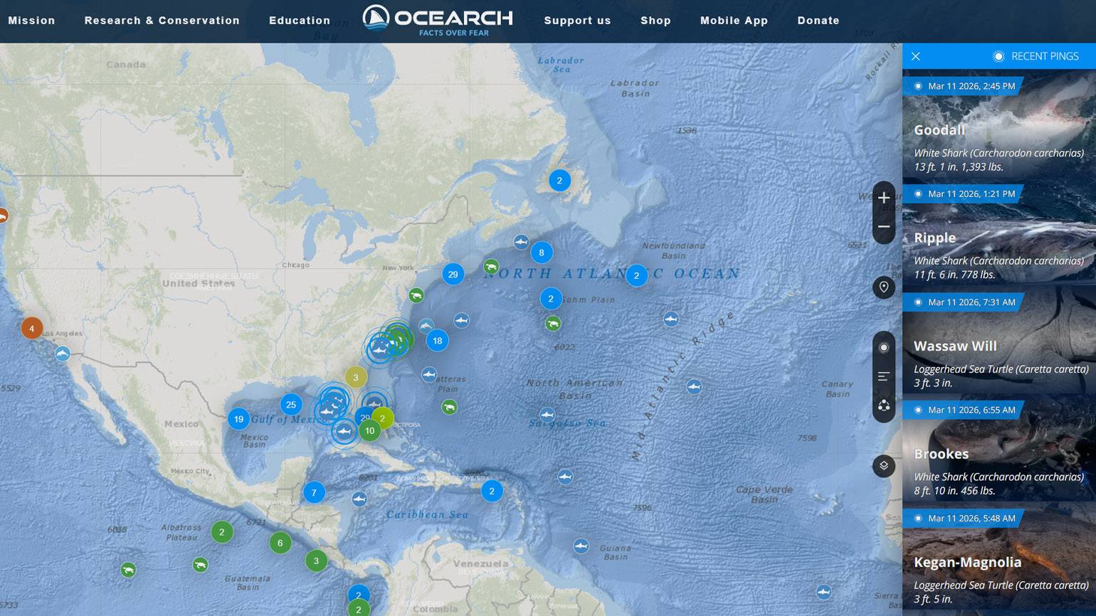 Ocearch Shark Tracker — онлайн-сервис, который отслеживает перемещения акул в реальном времени с помощью GPS-меток. На карте можно увидеть маршруты миграции, узнать размеры животных и другую информацию. Отличный способ почувствовать себя учёным и понаблюдать за морскими хищниками.