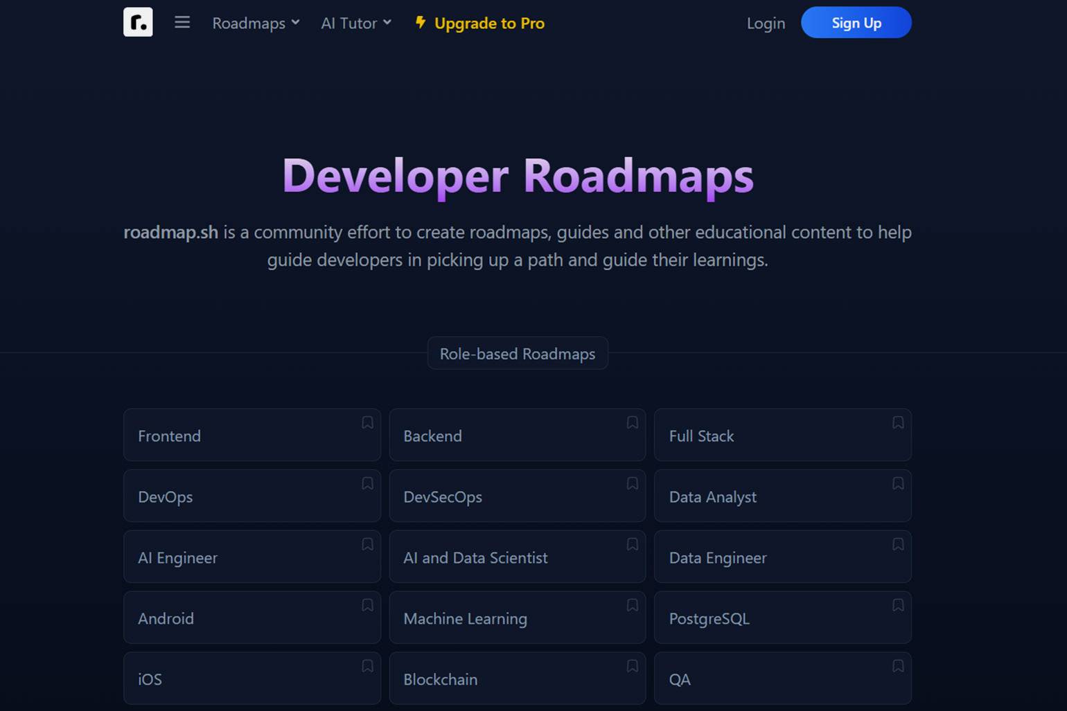 Roadmap.sh — набор интерактивных дорожных карт для изучения различных IT-направлений: от frontend-разработки до DevOps и кибербезопасности. Карты показывают, какие технологии и навыки изучать и в каком порядке.