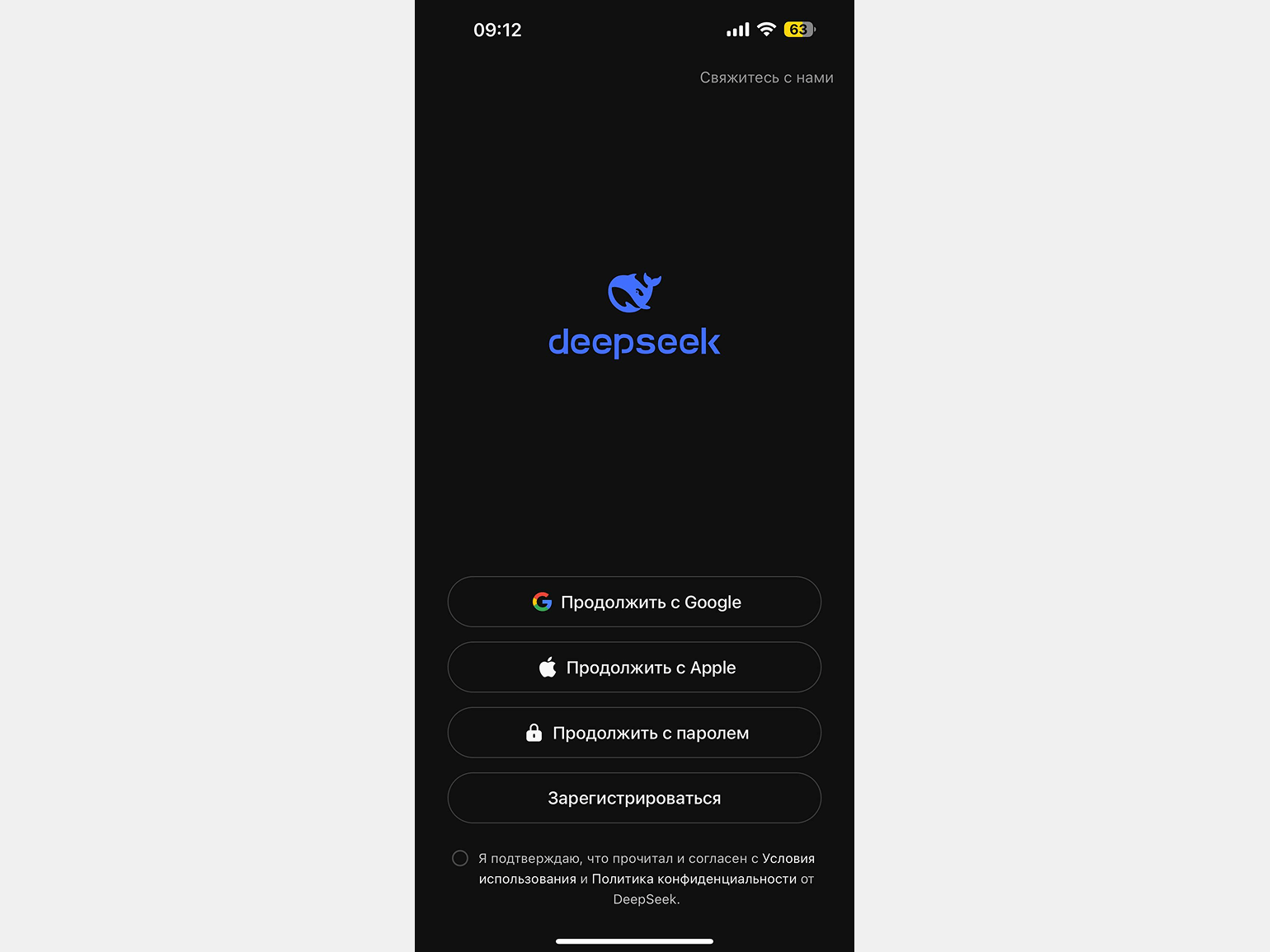 - Войдите с помощью аккаунта Google, Apple или пройдите регистрацию по электронной почте. На этом всё. Если вы ранее пользовались веб-версией, то при входе в мобильное приложение под тем же аккаунтом у вас синхронизируются все чаты.