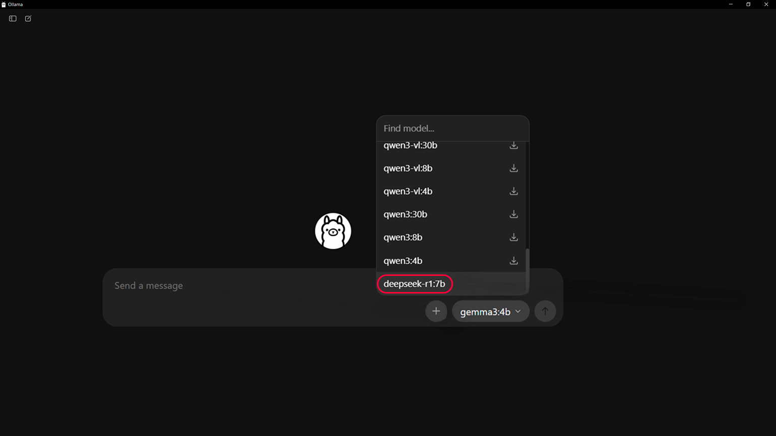 - Дождаться завершения загрузки и запустить модель командой: ollama run deepseek-r1:7b.