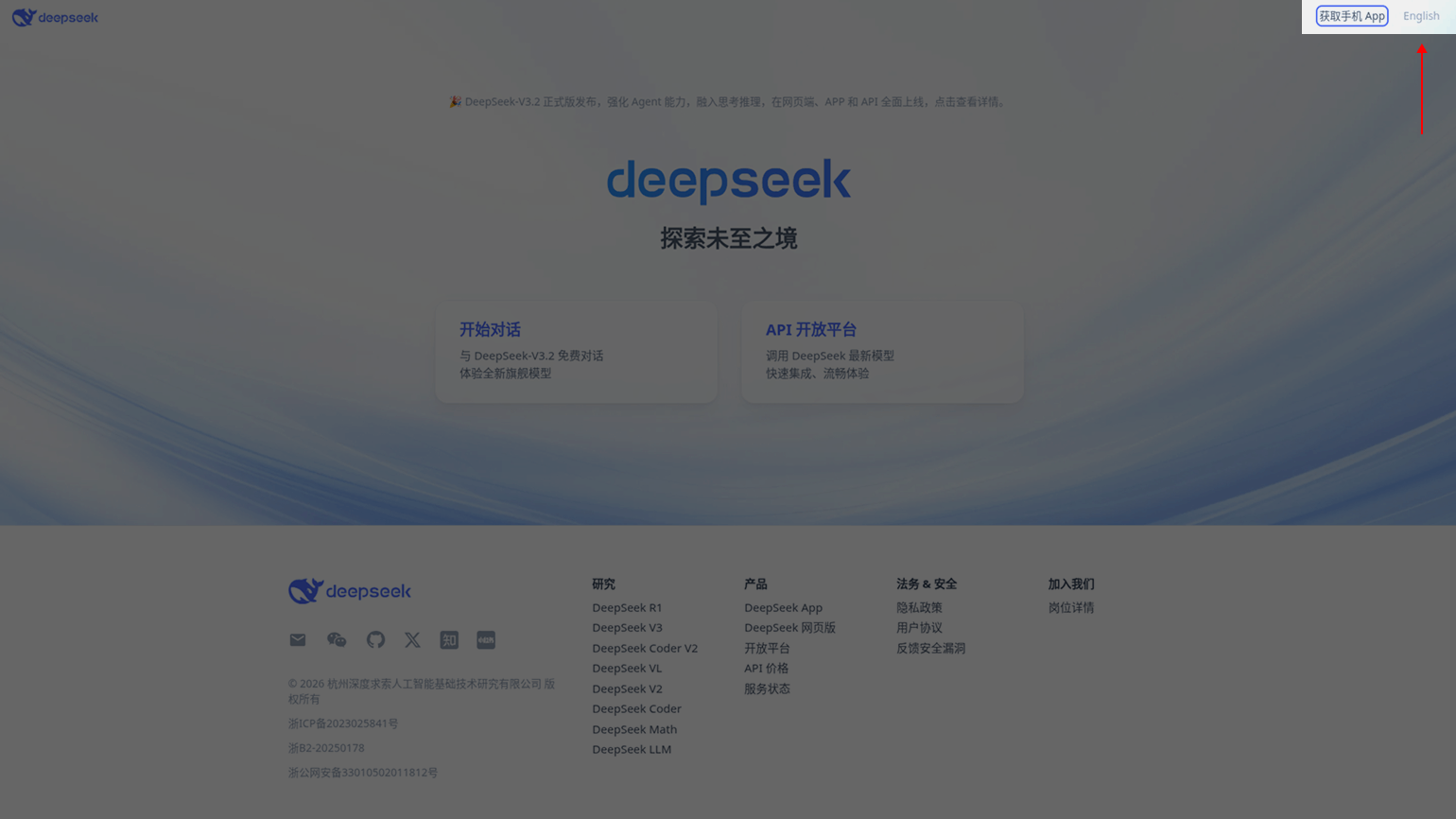 Теперь о том, как использовать DeepSeek на русском языке. Когда вы только переходите на сайт для регистрации (или разлогинились и хотите зайти заново), он по умолчанию открывается на китайском. Вы можете переключиться только на английский язык, нажав кнопку вверху.