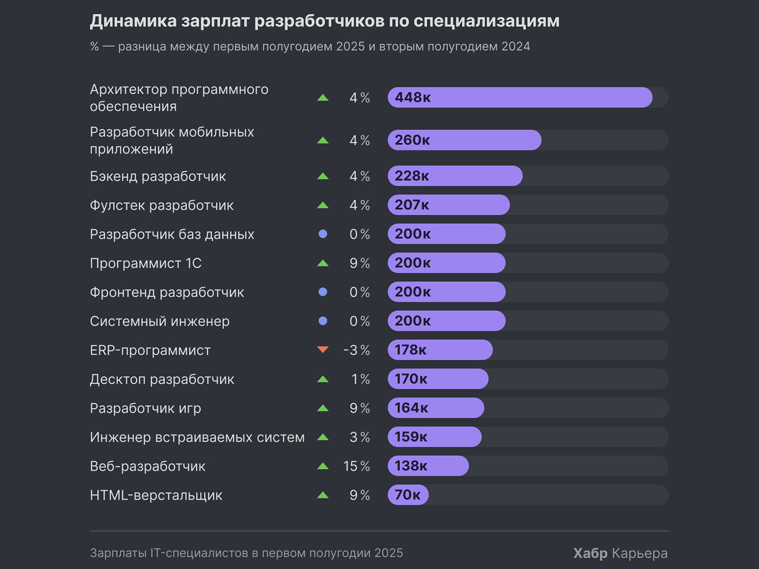 Средний уровень и динамика зарплат программистов по специализациям от «Хабр Карьеры»