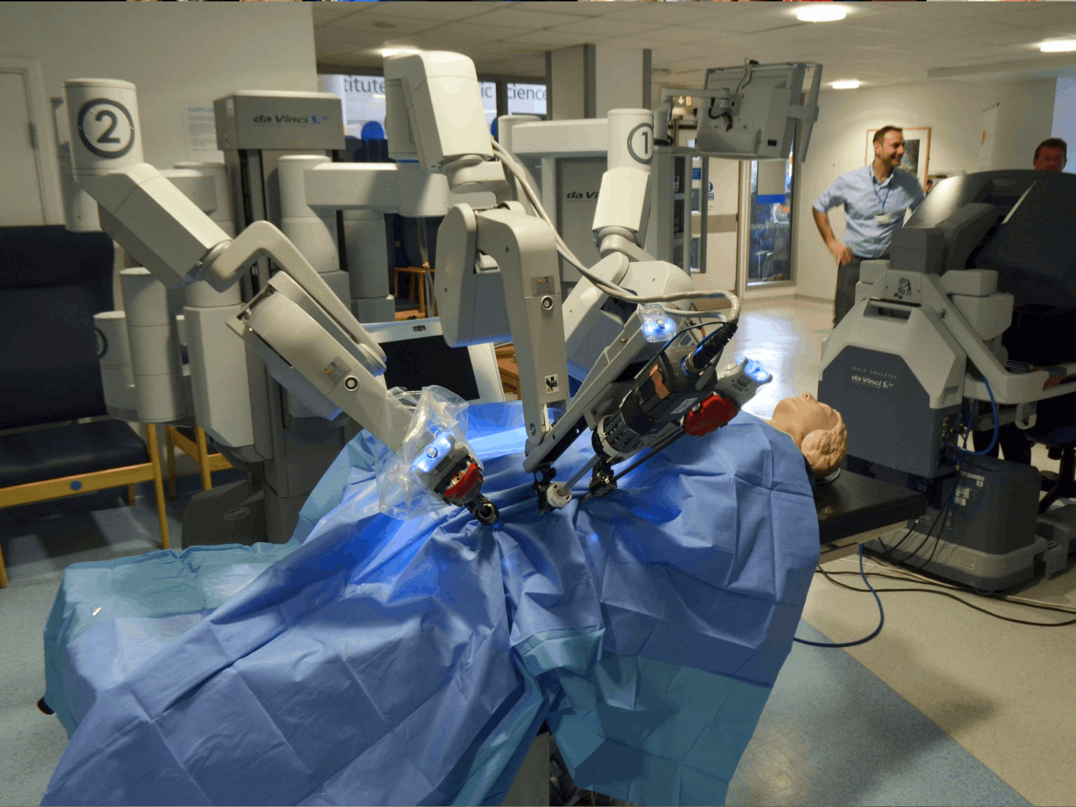 Один из самых известных примеров использования робототехники в медицине — роботизированная хирургическая система Da Vinci. Это платформа с несколькими манипуляторами и трёхмерной визуализацией операционного поля. Хирург управляет инструментами с консоли, а система точно передаёт движения рук врача на хирургические инструменты, позволяя выполнять сложные операции через минимальные разрезы.