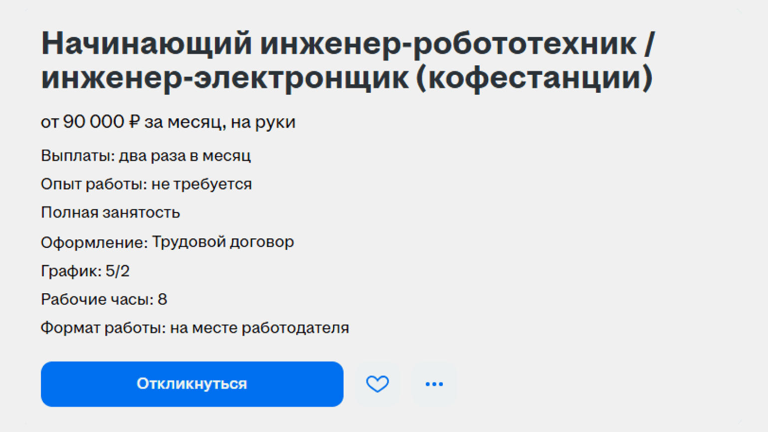 Средний уровень заработной платы инженера-робототехника — 90 442 рубля в месяц. При этом разброс зарплат между отдельными вакансиями существенный. В марте 2026 года на HeadHunter можно было найти предложения с вилкой от 50 тысяч до 300 тысяч рублей и выше. Размер заработной платы зависит от требований к опыту, масштаба проекта и умения работать с конкретными технологиями, например с FPV-дронами.