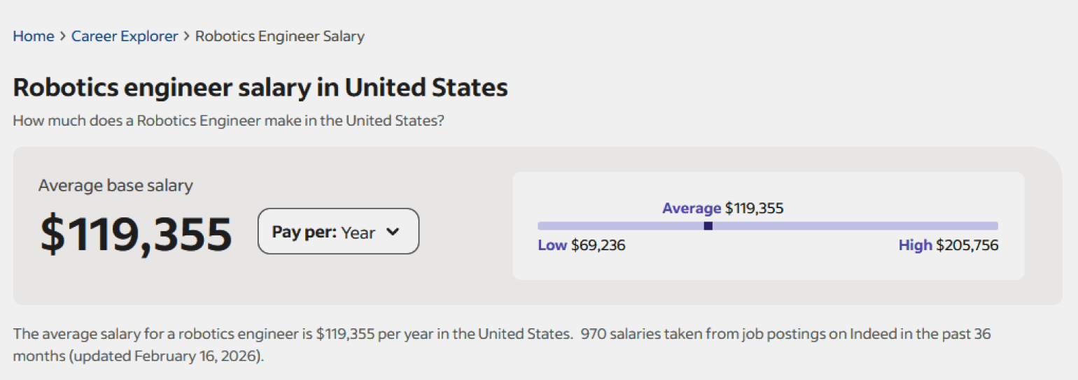 За рубежом доходы значительно выше. В США средняя базовая зарплата инженера-робототехника составляет около 119 000 долларов в год по оценкам Indeed.