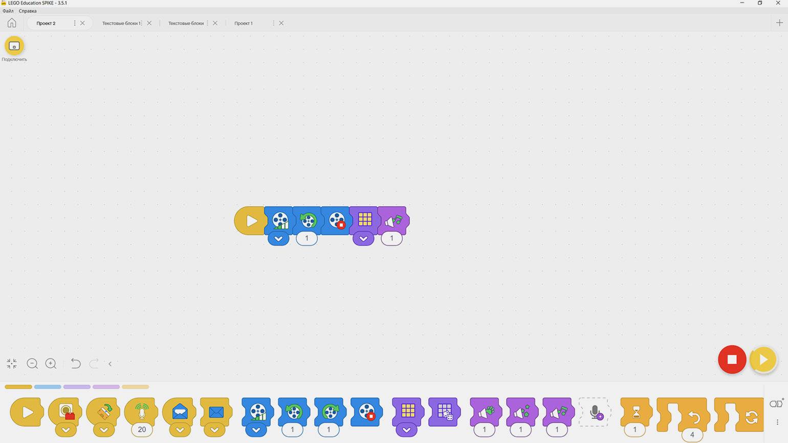 Блочное программирование схоже с аналогичными текстовыми блоками в приложении Spike, которое мы разбирали раньше. Создав программу, её можно перенести на устройство кнопкой запуска в правом нижнем углу.