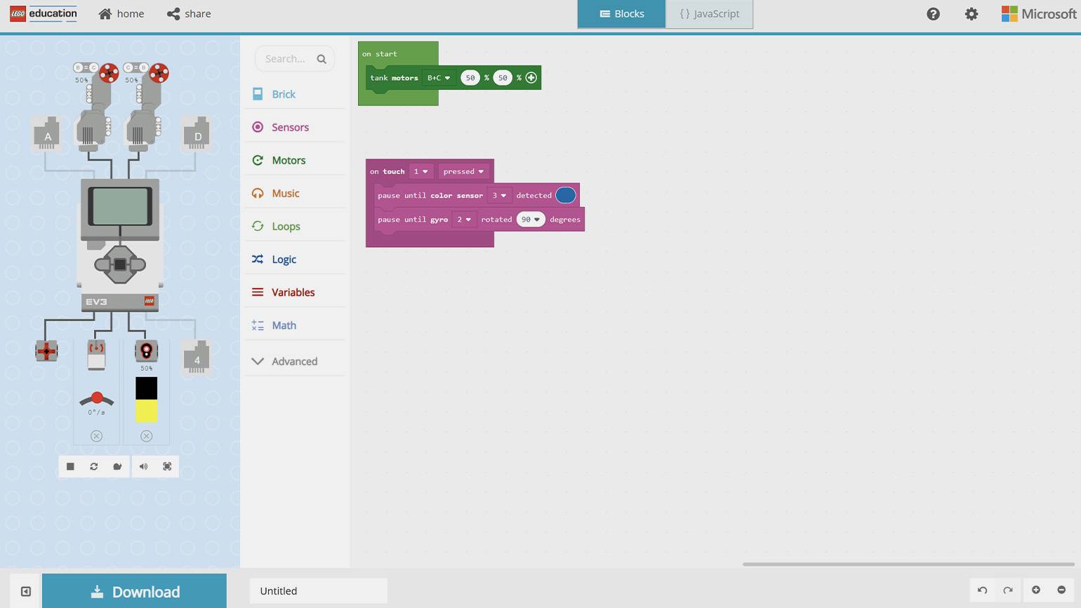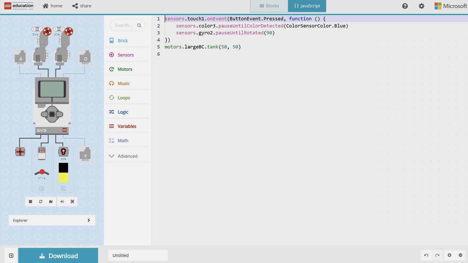 Бесплатная онлайн-среда от Microsoft с режимами блоков и текстовым программированием на JavaScript. Не требует установки клиента и работает через браузер на всех устройствах и платформах, где доступно подключение через USB и интернет-соединение. Для работы написанных программ на устройстве требуется прошивка EV3 не ниже версии 1.10E.
