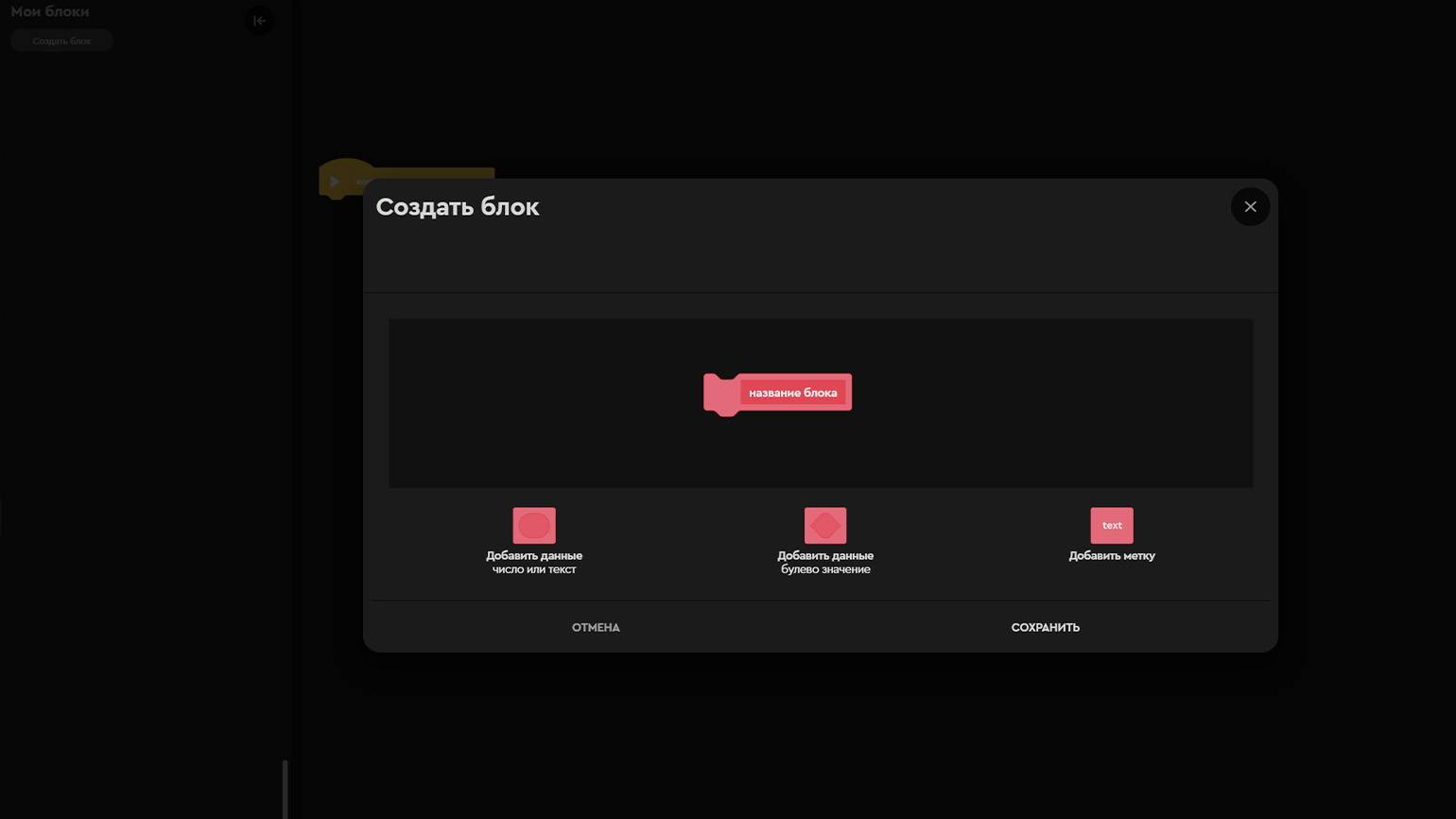 Также есть категории для создания блоков с индивидуальными настройками и параметрами: операторы с вводом значений (зелёный цвет), переменные (оранжевый цвет) и Мои блоки (красный цвет) — поле с кастомными блоками, в которые можно добавить значения, в том числе булевы, и метки-обозначения для удобства.