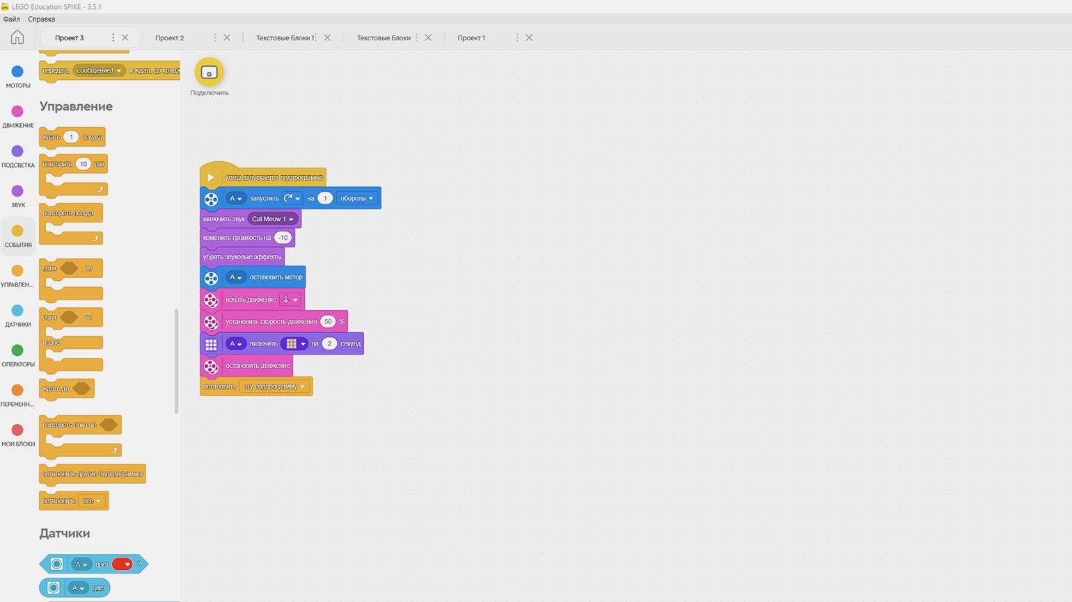 После сборки желаемой модели хаб конструктора подключается к ПК или планшету с помощью Bluetooth или USB-кабеля. Теперь можно создать проект в режиме блочного программирования или Python.