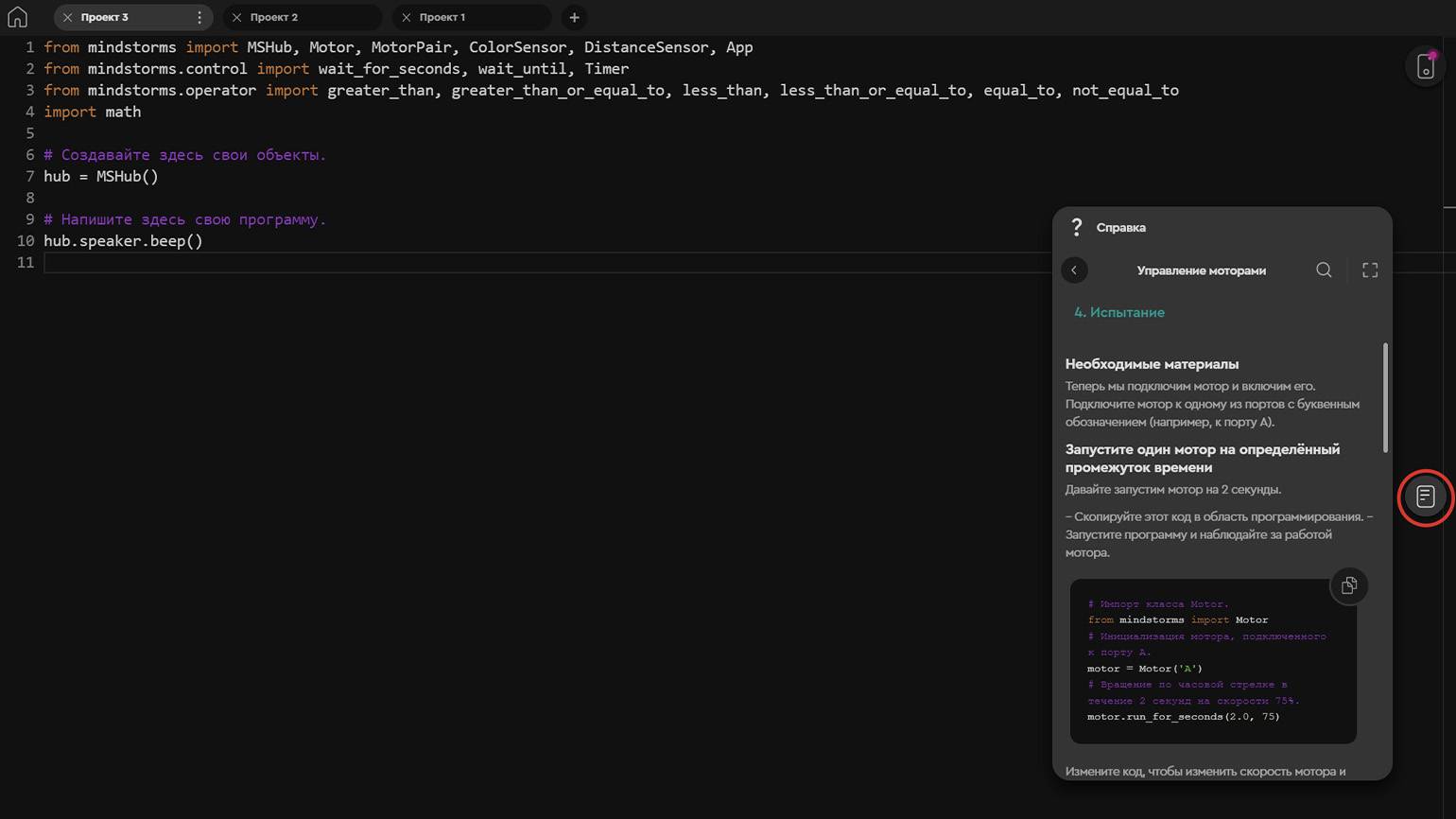 Для написания кода в верхнем левом углу веб-страницы создайте новую программу (знак +), выберите режим программирования и тип хаба. После этого запустится окно, где можно писать код. В правом нижнем углу (символ книги) доступны справочные материалы по основным командам MicroPython.