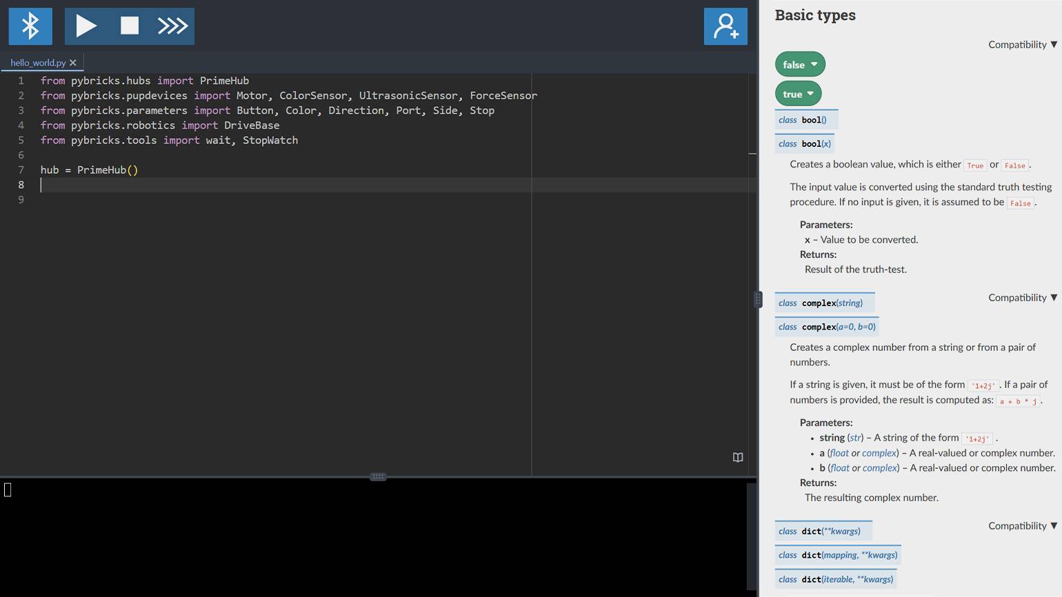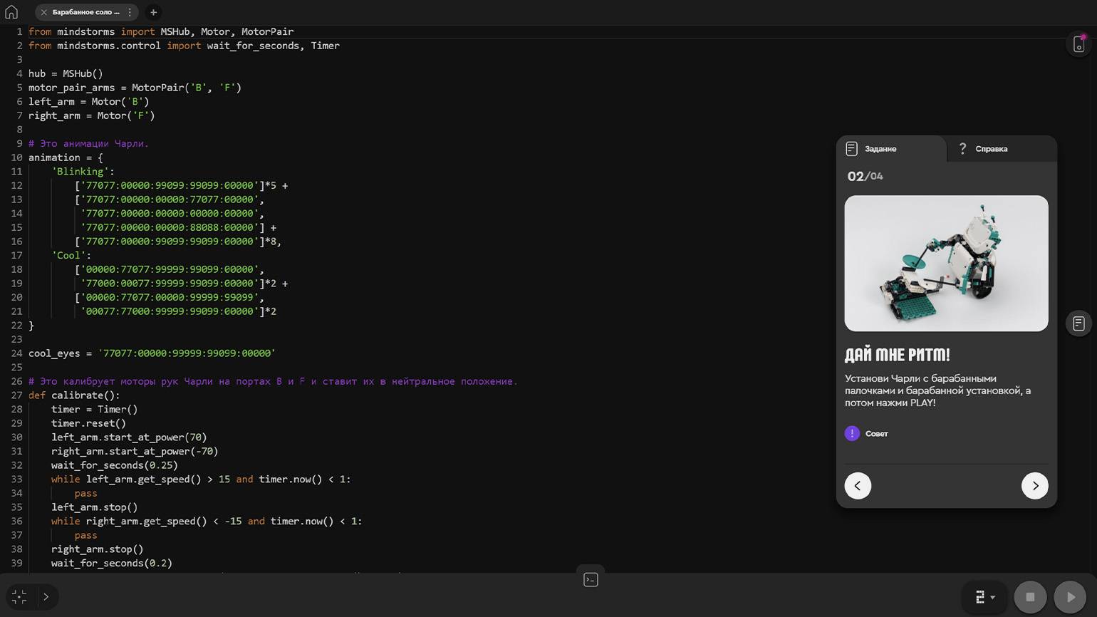 Текстовая среда Python — второй режим программирования в Robot Inventor. Для знакомства ребёнка с языком программирования в среду встроен подробный справочник, где можно узнать список основных функций, понять принципы работы с кодом и найти их примеры для разных действий: как подключить один из моторов, как работать с датчиками, как задавать переменные, циклы и так далее. Код из окна можно копировать напрямую в редактор, изменять значения и запускать программу, чтобы посмотреть, как изменилось поведение робота.
