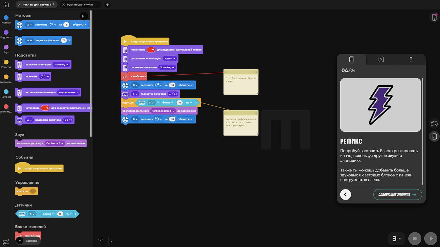 Основное отличие режима Текстовые блоки от Блоков иконок в расширенном списке команд и настроек, которые подойдут для создания сложных циклов действий. А параметрическая система позволяет точнее настроить поведение модели: скорость вращения мотора, градусы поворота, заданное время для выполнения действий и так далее.