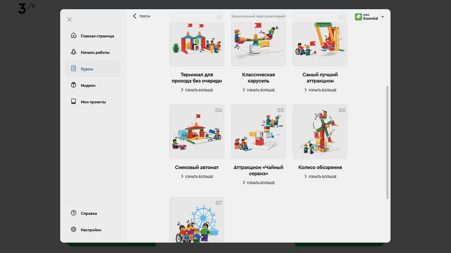 В ПО есть подробные инструкции по сборке разных вариантов Spike Essential — от роботов и транспорта до аттракционов. Чтобы разобраться с основами программирования с помощью блоков, ребёнок может выбрать раздел «Курсы» с 38 пошаговыми уроками, объединённых в несколько сюжетов.