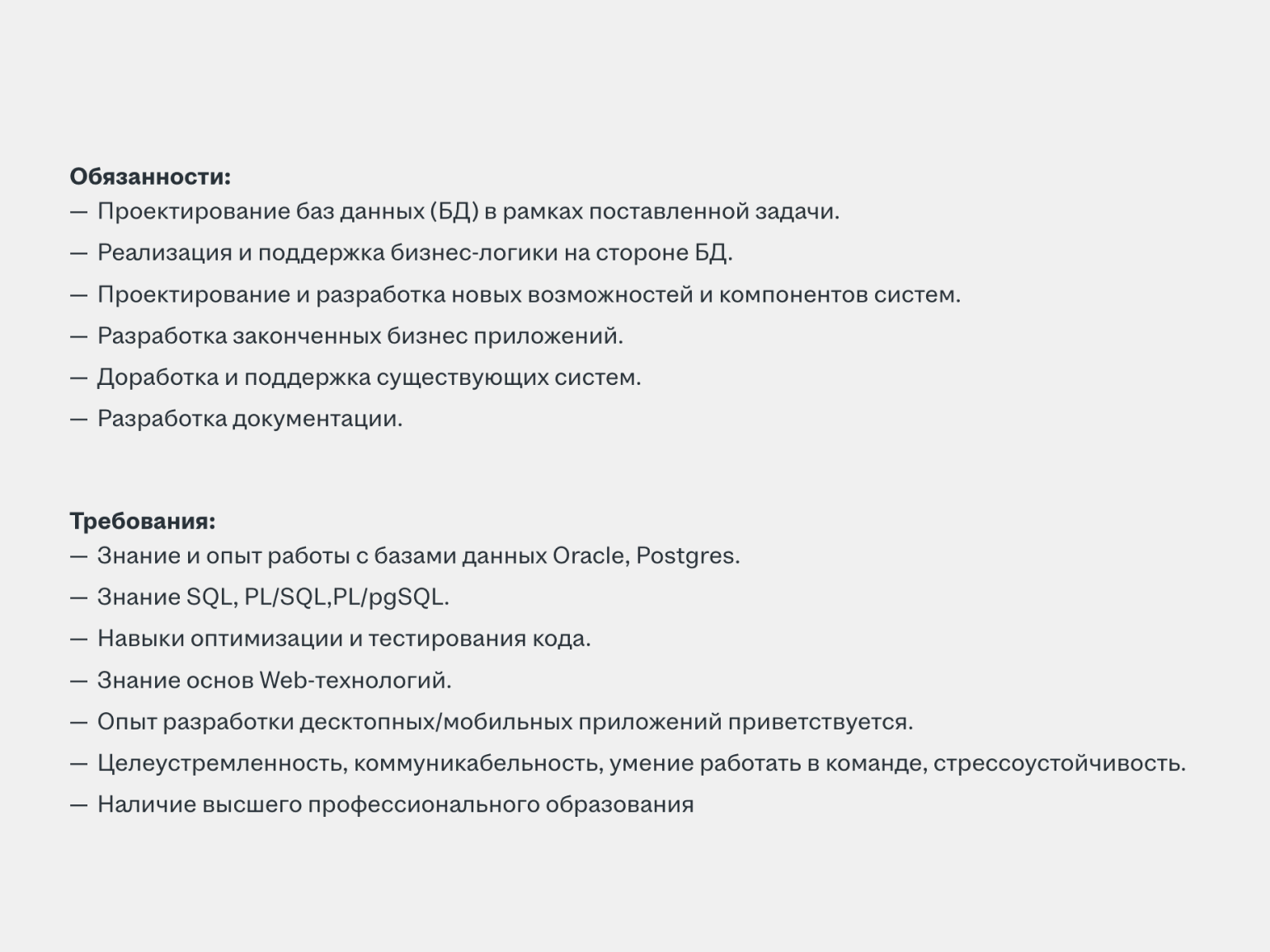 Работа ведётся в рамках заданной архитектуры и выбранного технологического стека. Ключевая задача разработчика — реализовать решение на уровне кода так, чтобы система работала стабильно и корректно проходила тесты.