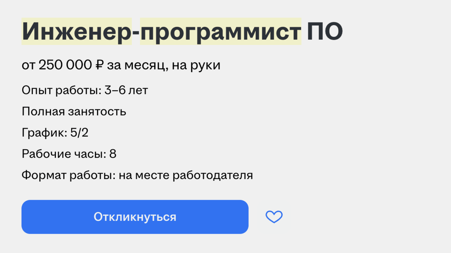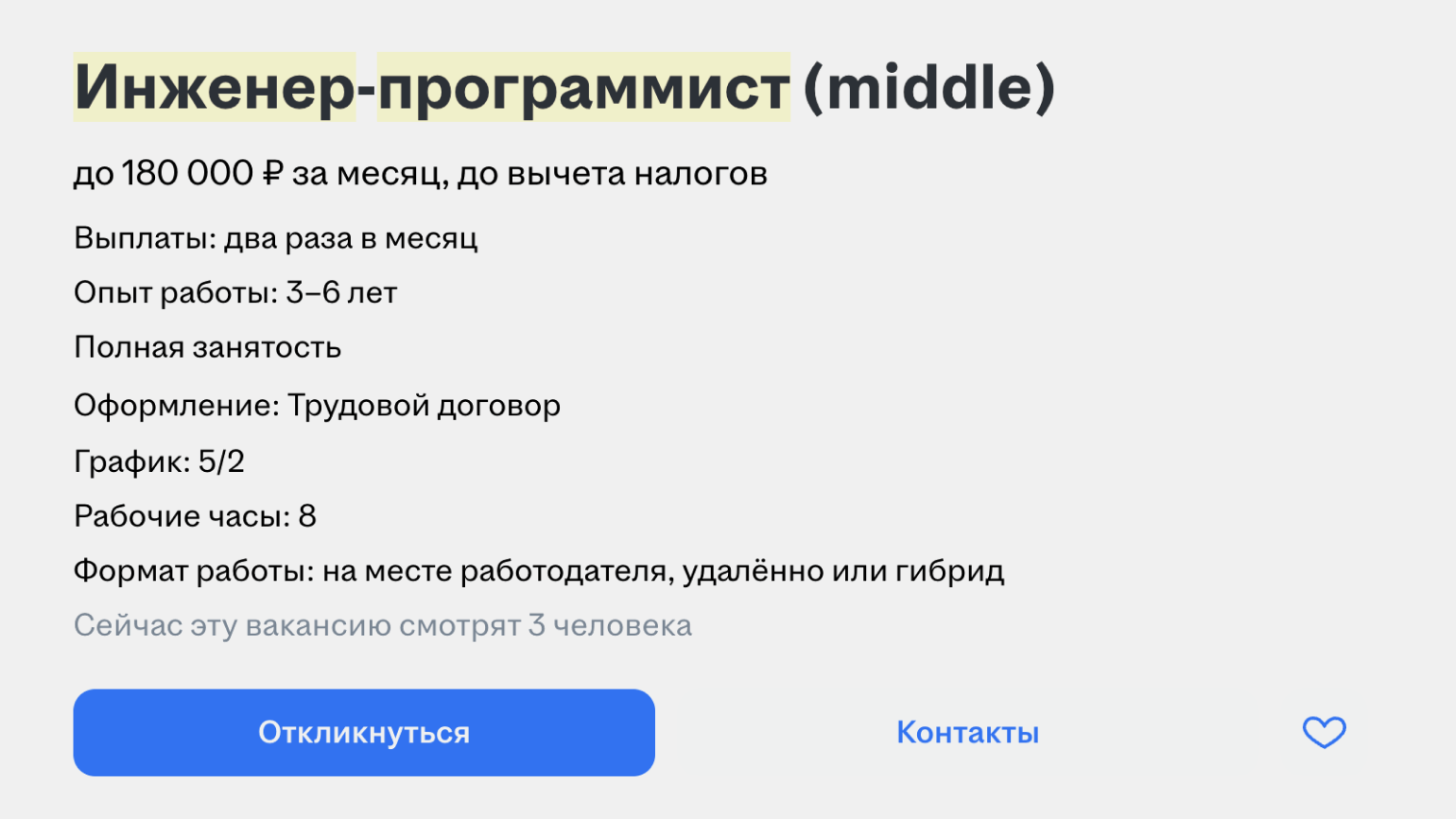 Заработок программных инженеров, по данным «HH Карьеры», в первую очередь зависит от их опыта. Начинающие специалисты могут рассчитывать в среднем на 85 000–100 000 рублей. Инженеры уровня middle — на 135 000–150 000 тысяч рублей. Senior-специалисты с опытом от трёх лет получают в среднем от 185 000 рублей.