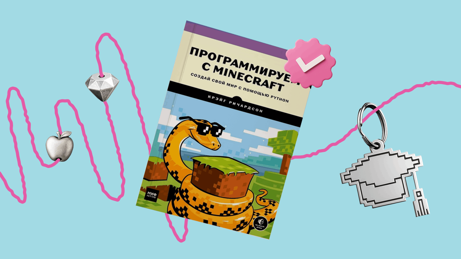 Необычный формат: обучение построено через знакомую многим детям компьютерную игру. Команды Python здесь напрямую влияют на мир Minecraft — можно строить дома, менять ландшафт или перемещаться по карте. Это делает процесс обучения увлекательным даже для тех, кто обычно не любит читать учебники.