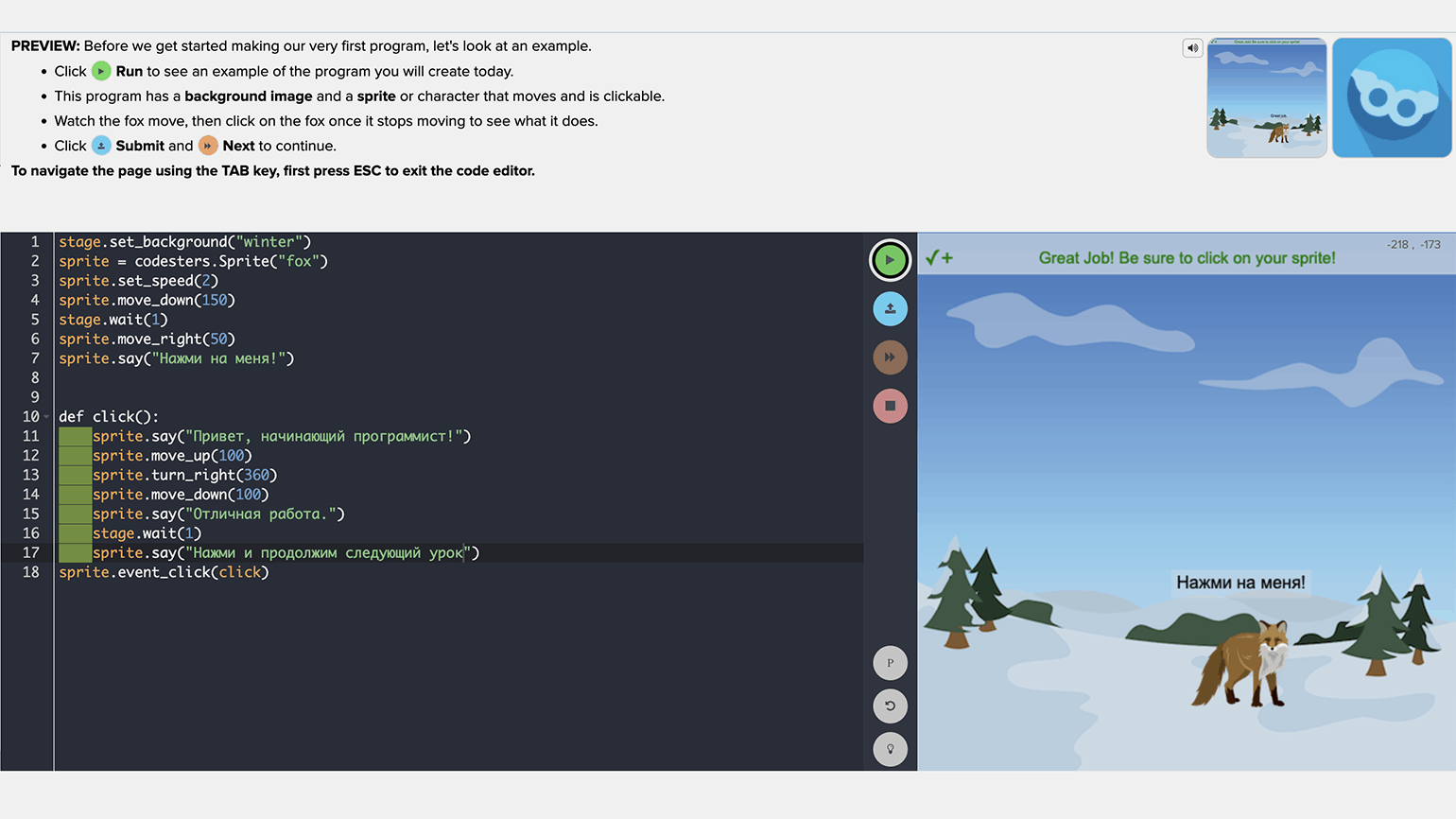 Точные сообщения об ошибках. Если код написан неправильно, то учащийся увидит понятную информацию о том, где именно он сделал ошибку и в чём её причина. Благодаря этому легко всё исправить.