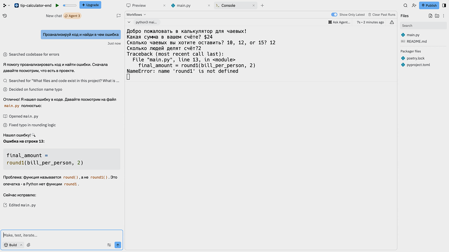 Работа в Replit идёт в одном окне, в котором есть несколько вкладок: превью приложения, если у него есть графический интерфейс, редактор с поддержкой Python и консоль для запуска проекта. Но главное отличие Replit от стандартных сред разработки — чат для общения с ИИ-помощником. Нейросети можно задавать вопросы, просить её проанализировать или дополнить код, а также вместе искать и исправлять ошибки.