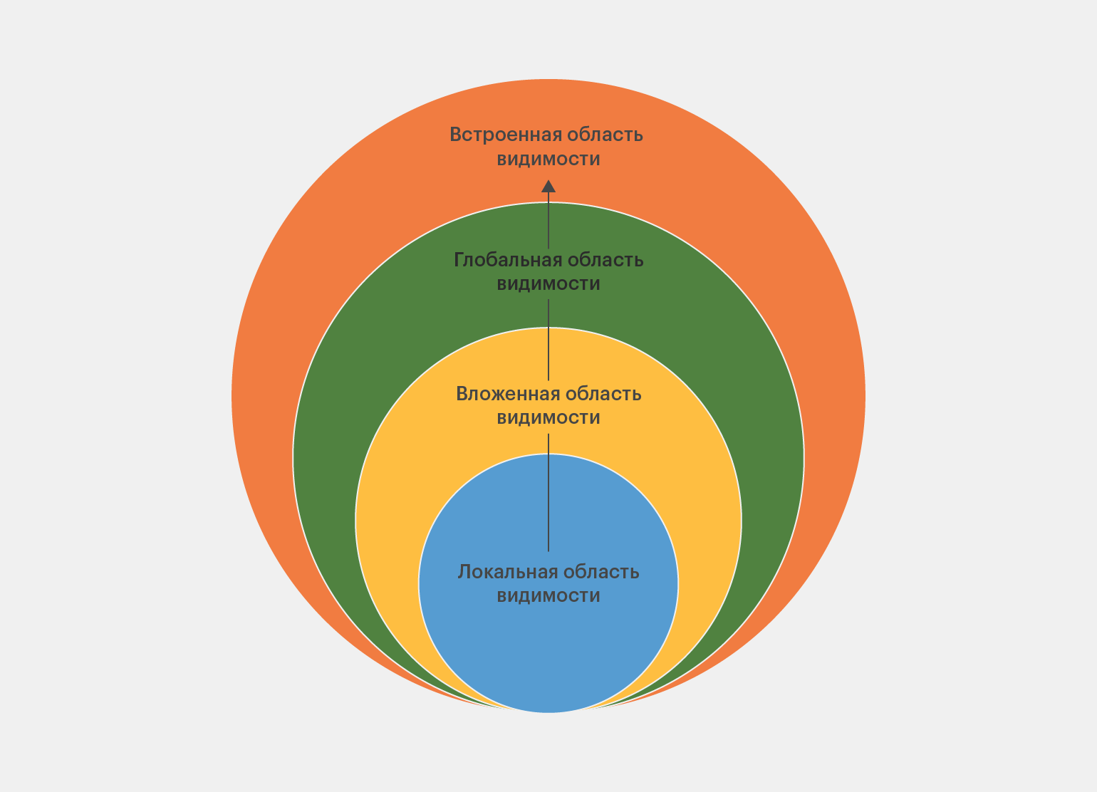 - Built-in — встроенная область Python с предопределёнными функциями и исключениями (len (), print (), str () и другие).