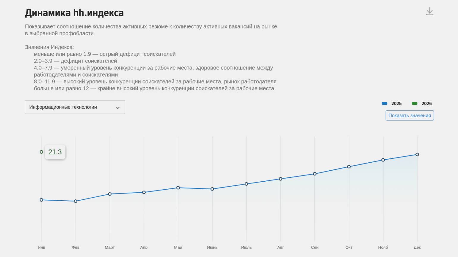 Российский IT-рынок столкнулся с резким ростом конкуренции из-за сокращения вакансий и одновременного притока соискателей. По данным HeadHunter, в январе 2026 года на одну вакансию приходилось в среднем 21,3 резюме — более чем вдвое больше, чем годом ранее, когда этот показатель составлял всего 9,9.