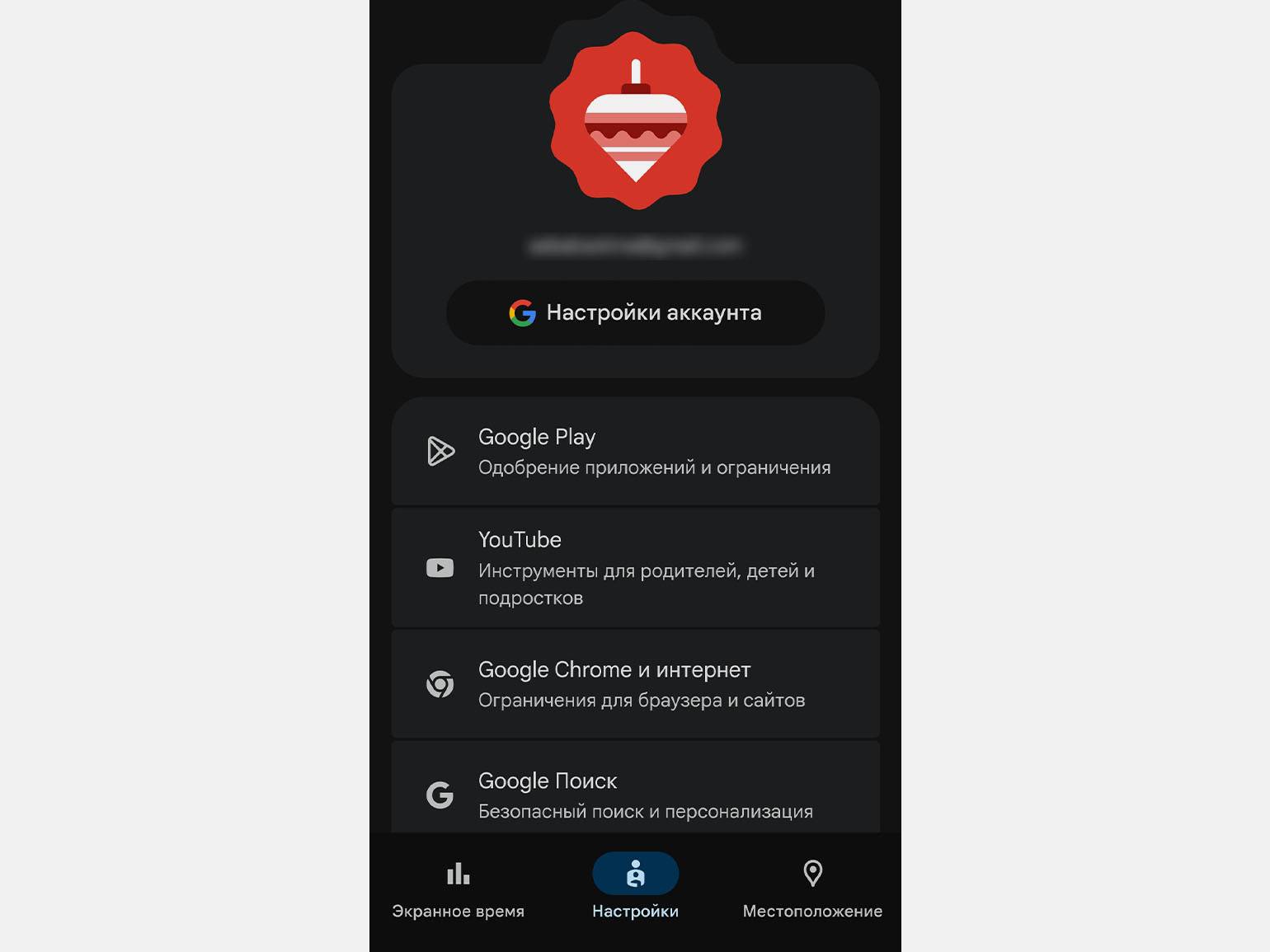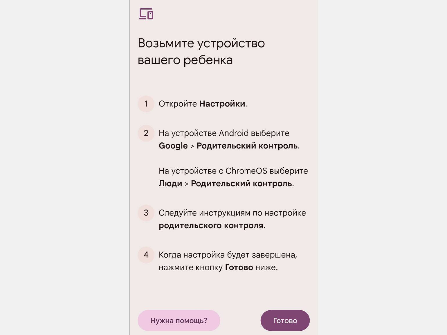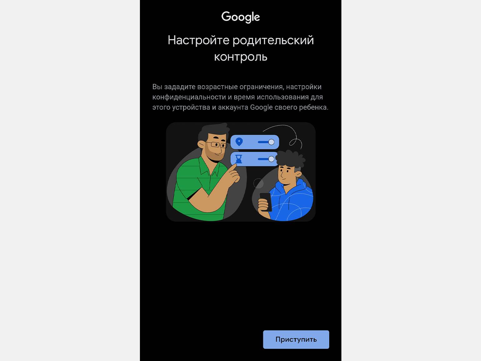 После этого возьмите смартфон ребёнка, перейдите в настройки и подключите родительский контроль. Свой смартфон далеко не откладывайте — он скоро понадобится для подтверждения аккаунта.