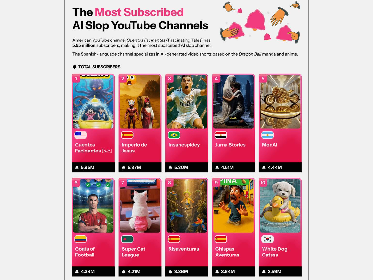 По числу подписчиков лидирует Испания — в общей сложности 20,22 миллиона человек смотрят восемь самых популярных ИИ-каналов. Южная Корея занимает первое место по общему количеству просмотров: 8,45 миллиарда у 11 каналов. Также в исследовании упоминается индийский канал Bandar Apna Dost, который набрал более 2 миллиардов просмотров и, по примерным оценкам, зарабатывает около 4 миллионов долларов в год на рекламе. Напомним — весь контент сгенерирован искусственным интеллектом без участия человека в производстве.