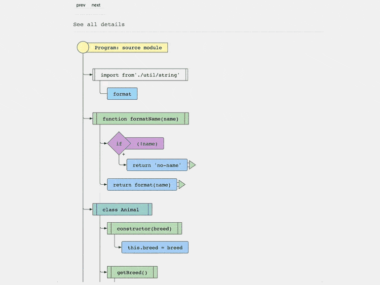 js2flowchart — open-source-библиотека для визуального разбора JavaScript-кода. Она преобразует исходный код в блок-схему, которая наглядно отображает последовательность выполнения программы, условные операторы (if/else, switch), циклы (for, while, do while) и вызовы функций. Такая визуализация может пригодиться при рефакторинге унаследованного кода, адаптации новых разработчиков в проекте, создании технической документации и прочего.
