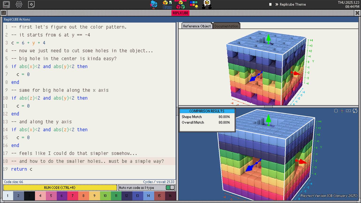 Replicube — игра-головоломка в Steam для изучения основ программирования, где вам предстоит создавать 3D-объекты из воксельных кубиков. В игре более 50 головоломок разного уровня сложности, есть режим свободного творчества для экспериментов, таблицы лидеров для сравнения эффективности кода, а также 2D-редактор для создания пиксельных изображений и GIF-анимаций.