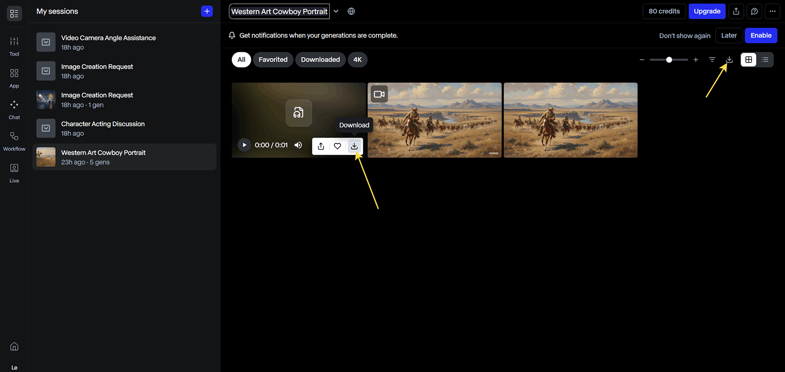 Сгенерированные в Runway материалы можно найти в Asset Library — библиотеке контента. Чтобы открыть её, нажмите на вкладку с вашей сессией, далее — на три точки и выберите пункт See generations in Asset Library.