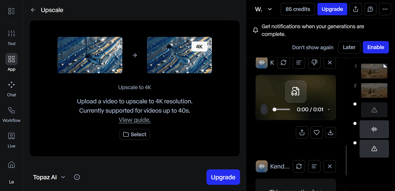 Upscale увеличивает разрешение видео. Поддерживаются разные варианты, включая 4K. Продолжительность видео не должна превышать 40 секунд.