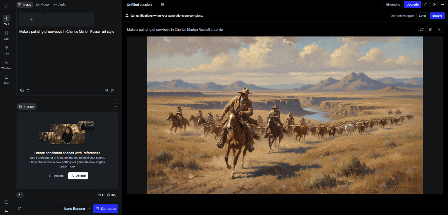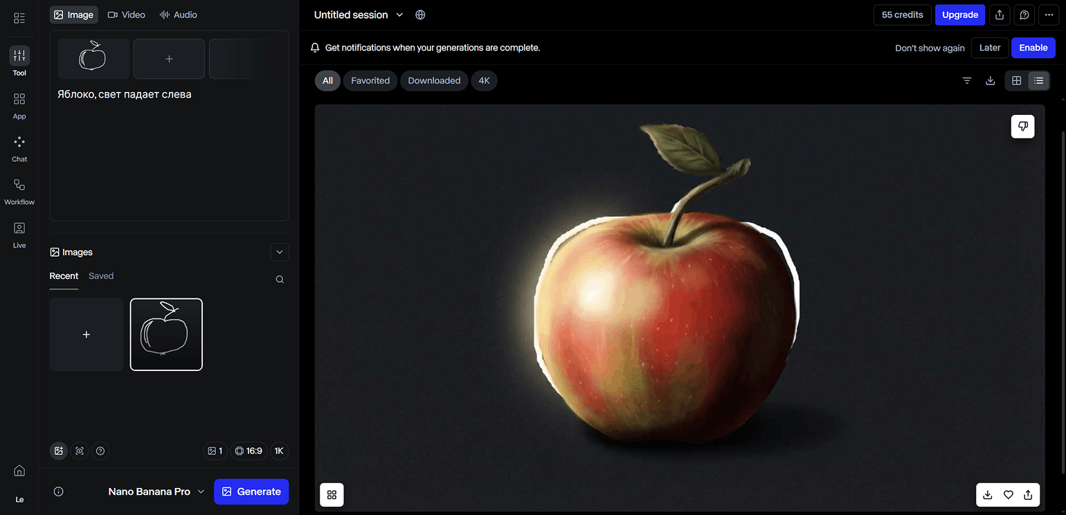 - Возможность комбинировать разные модели для создания контента. Можно выстраивать цепочку из промптов, референсов и разных ИИ-инструментов, чтобы получить лучший результат или автоматизировать обработку контента.