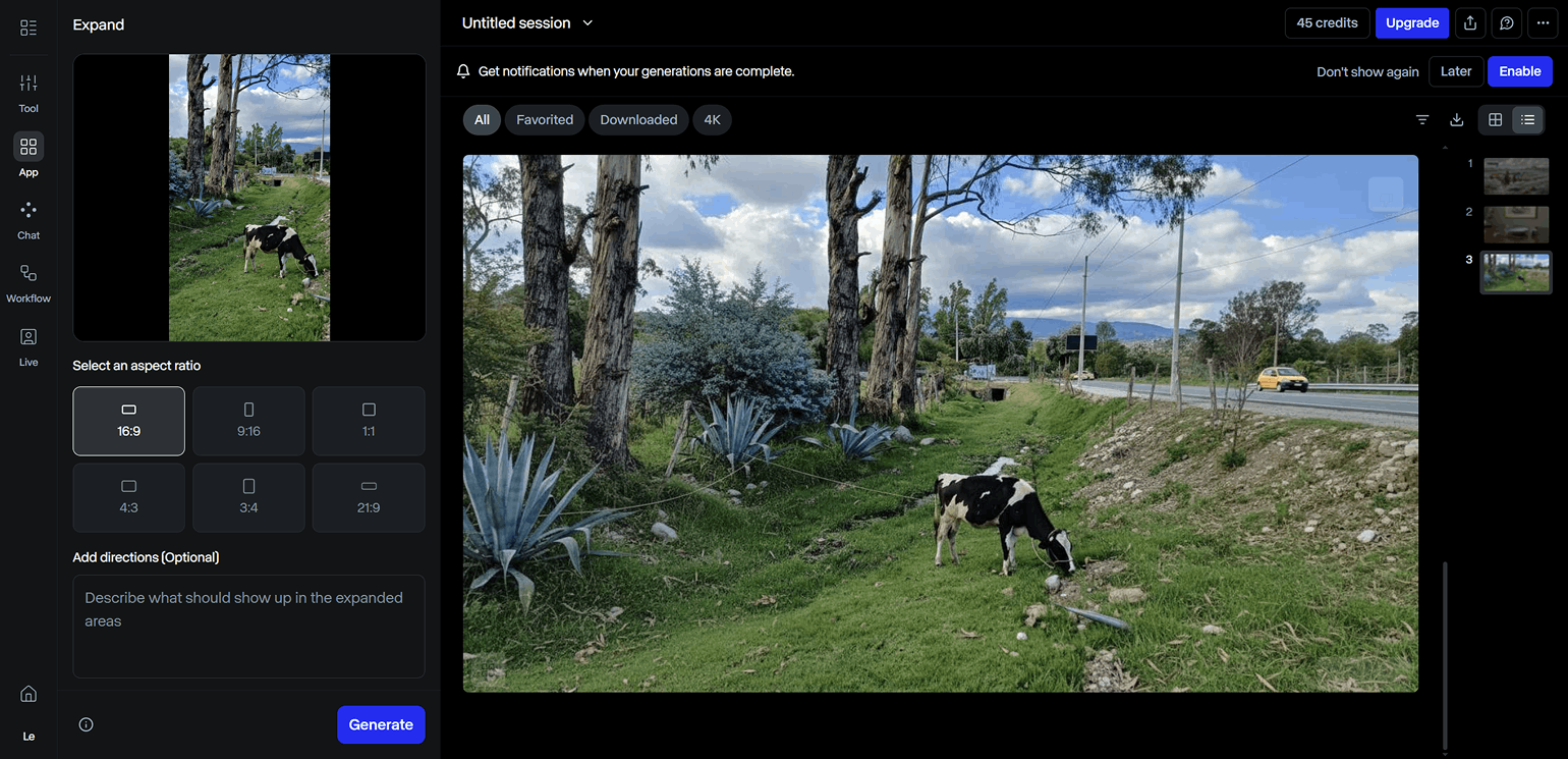 Expand — инструмент для изменения соотношения сторон изображения. Нейросеть сгенерирует недостающие области картинки, ориентируясь на исходное изображение и текстовый промпт.