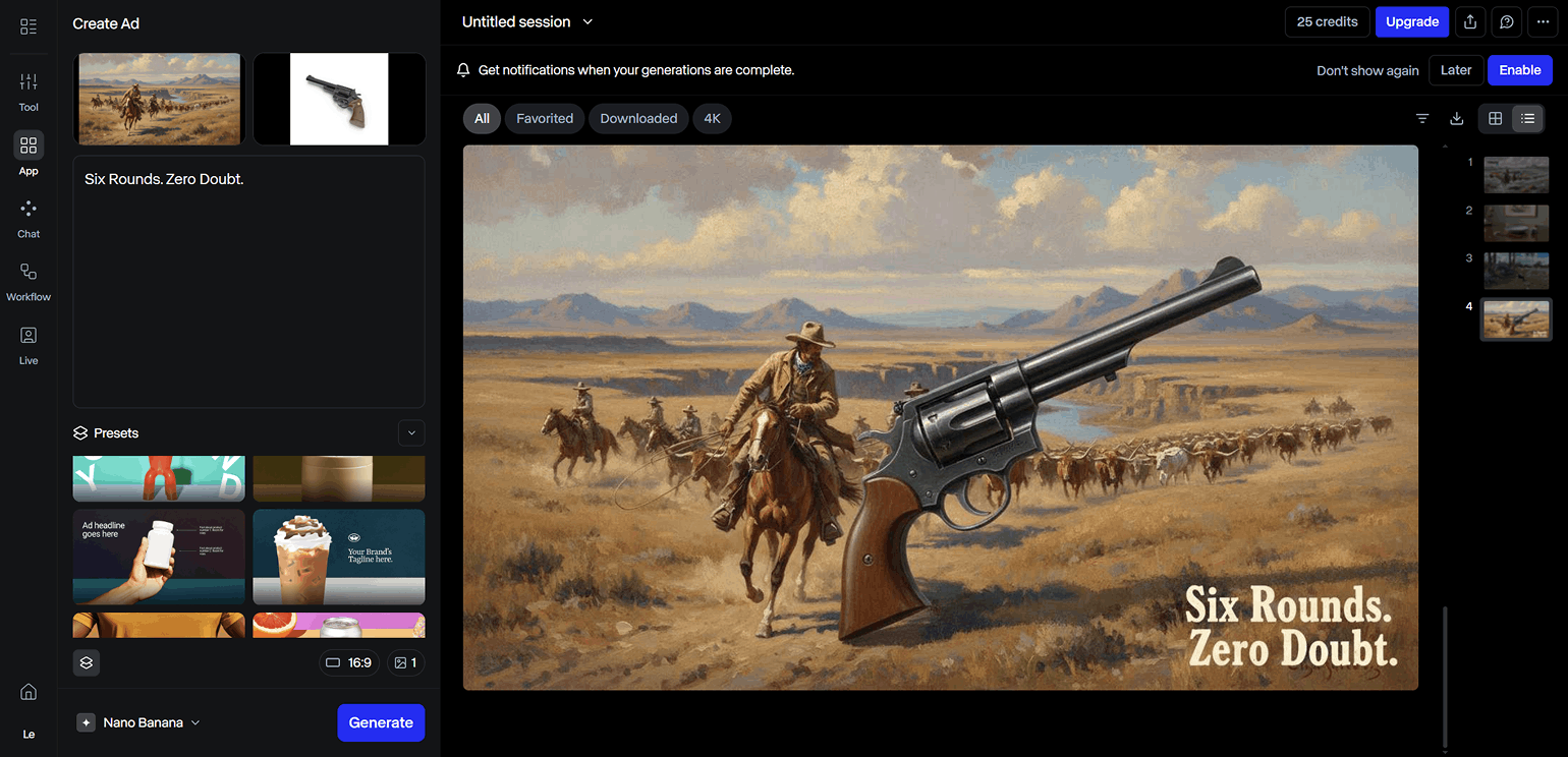 Create Ad используется для генерации баннеров и других промоматериалов. Пользователям доступно десять готовых пресетов для рекламы различных вариантов продукции, например напитков или аксессуаров.