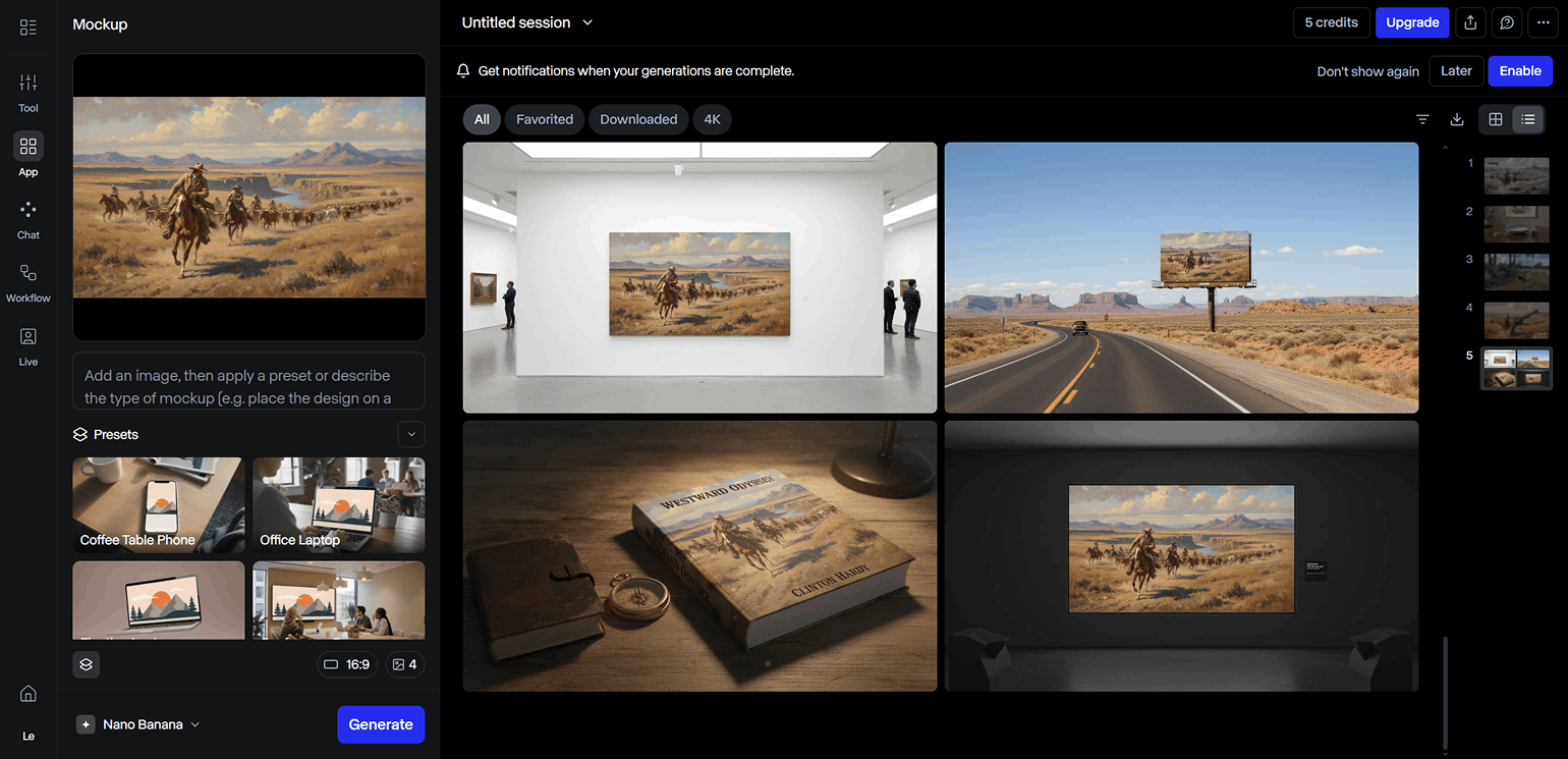 Mockup — инструмент для «примерки» дизайна на различные объекты и окружение. В Runway доступно много готовых пресетов — от одежды до муралов в стиле мозаики. Если не выбрать шаблон, то нейросеть создаст мокапы на своё усмотрение.