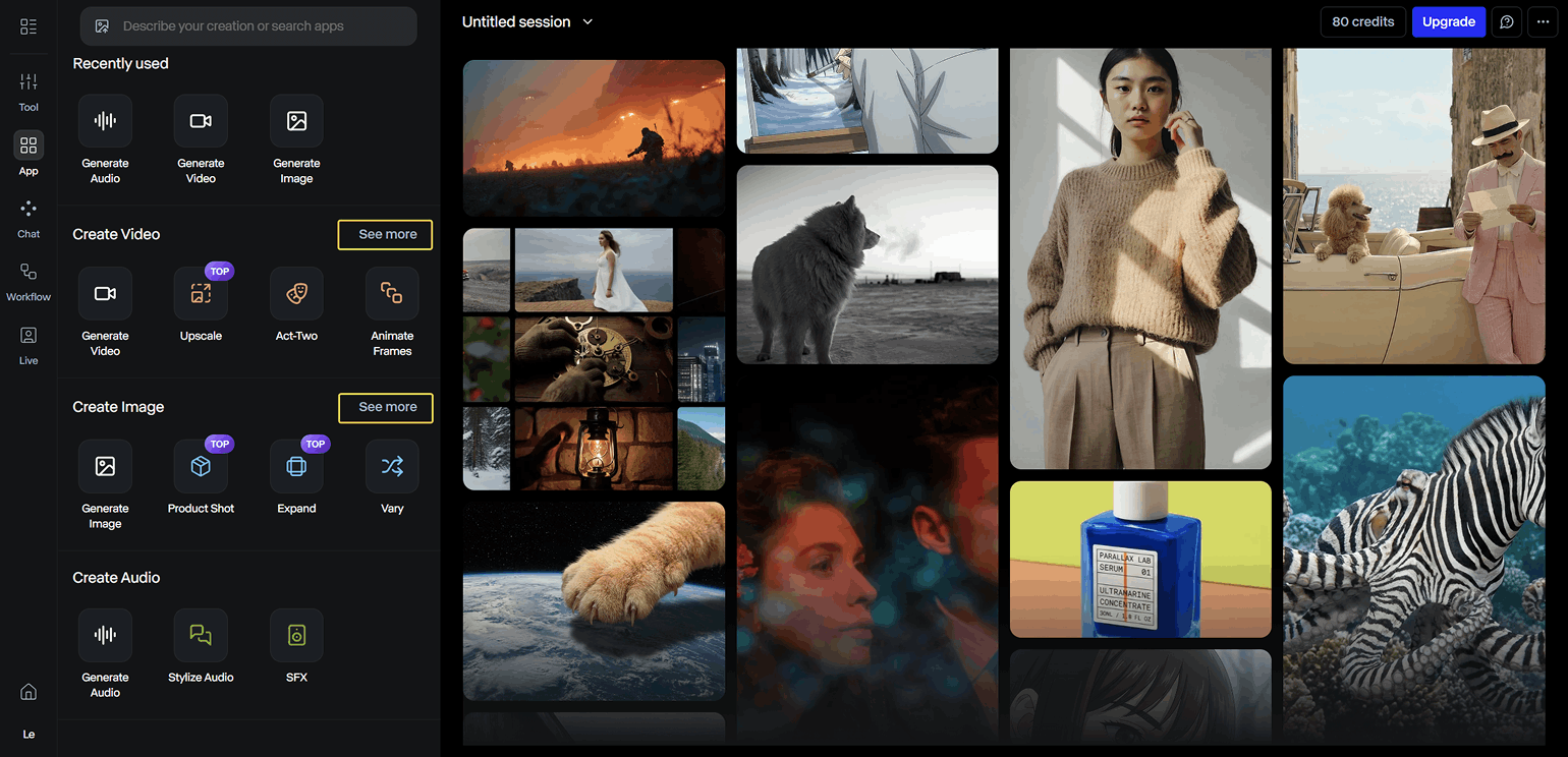 В левой верхней части рабочего пространства можно выбрать один из трёх режимов генерации — изображение (Image), видео (Video) и аудио (Audio). Они дублируются в разделах Tool и App.