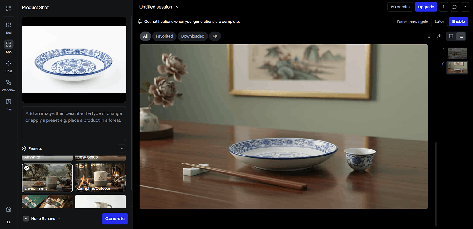 Product Shot позволяет создать изображение с конкретным предметом в реалистичном окружении. Инструмент подойдёт тем, кто хочет получить фотографию какого-либо товара или изделия, но не готов проводить реальную фотосъёмку.