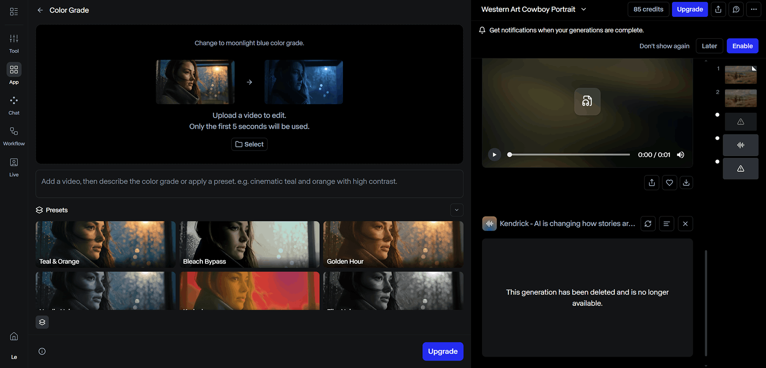 Color Grade — инструмент для цветокоррекции видео. Можно использовать готовые пресеты или написать инструкцию в промпте.