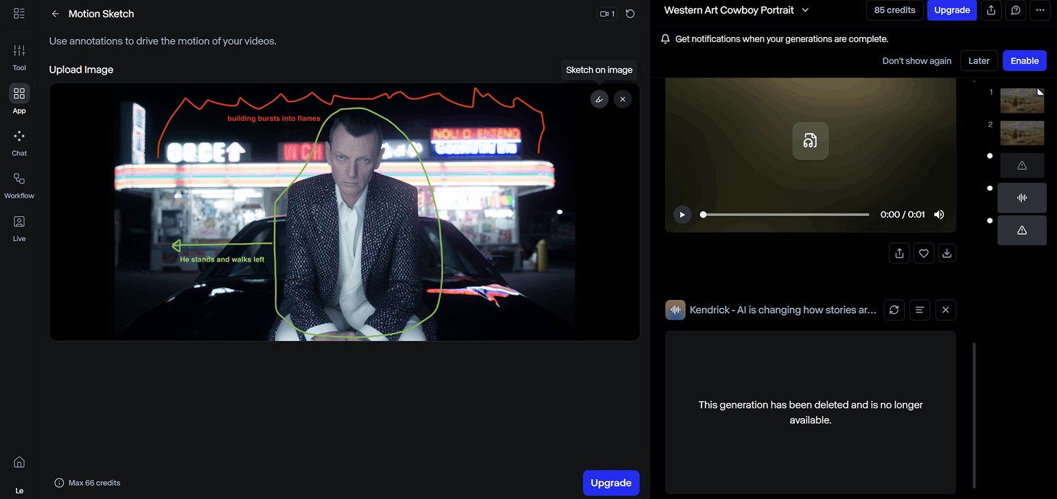 Motion Sketch — инструмент генерации видео по изображению с комментариями пользователя. Пометки на кадре делаются с помощью инструмента Sketch on Image.