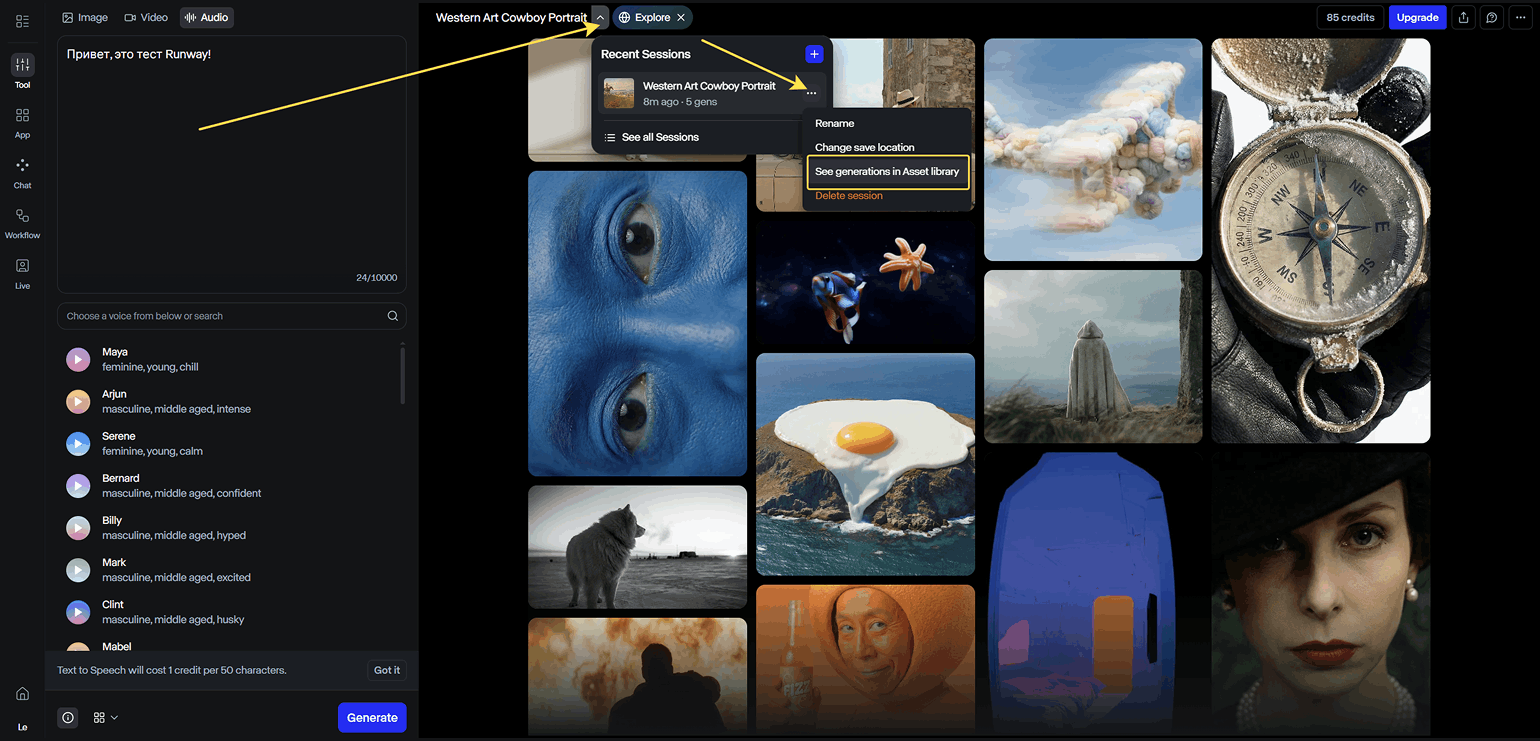 Создание изображений, видео и аудио в Runway