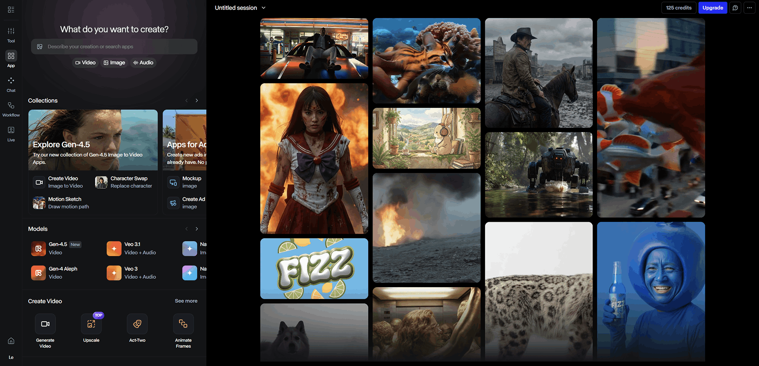Бесплатный тариф даёт доступ к устаревшим моделям, например Gen-4 Turbo или Gemini 3 Pro, и ограниченному набору инструментов для работы с изображениями и видео. Кроме того, пользователь получает всего 125 кредитов на любые действия. Этого количества хватит на создание 20–30 изображений или 5–10 коротких видео. Лимит обновляется раз в месяц.