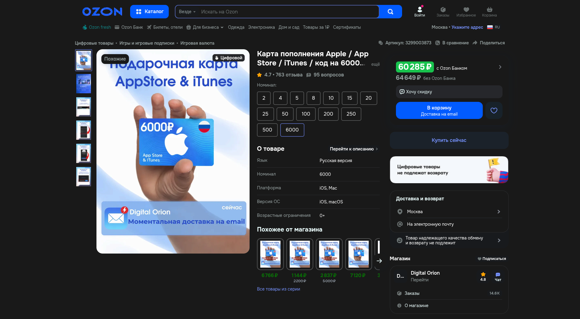 Подарочные карты работают, но цены на них заоблачные. Формально картами можно оплатить сервисы Apple, но купить карту по номиналу невозможно: на маркетплейсах их либо нет в наличии, либо они продаются с огромной наценкой. Например, карта на 6 000 рублей продаётся на Ozon за 64 649 рублей.