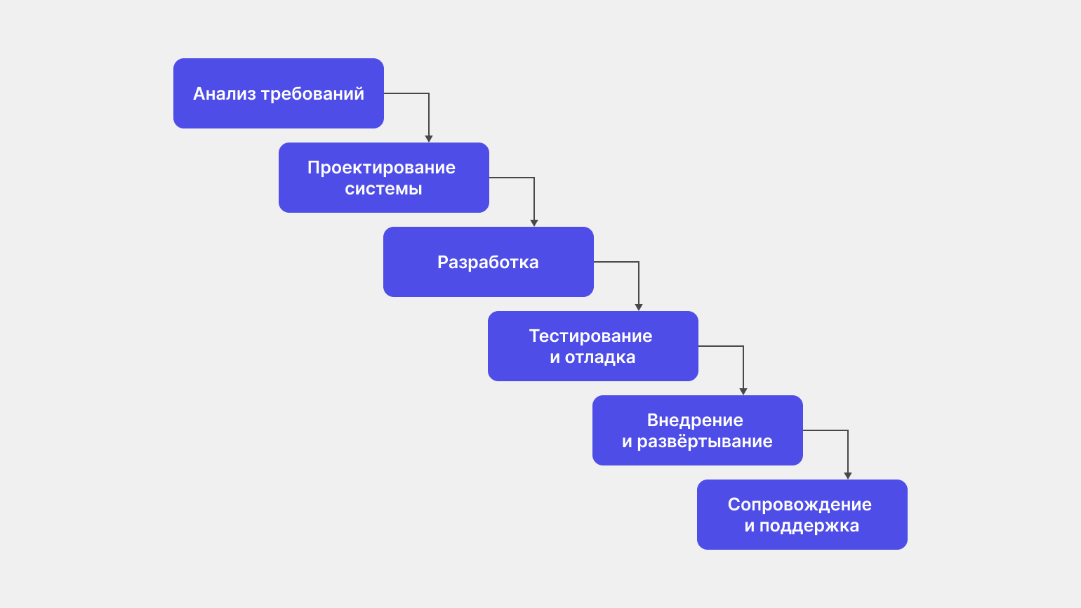 Каскадная, или водопадная, модель появилась в 1970 году благодаря публикации статьи Уинстона Ройса — Managing the Development of Large Software Systems. В ней Ройс предложил идею, что разработка ПО должна проходить через строгую последовательность этапов — от анализа требований до поддержки. И в этой модели каждый шаг должен полностью завершаться перед началом следующего — по аналогии с промышленным конвейером, где деталь переходит на следующую станцию только после обработки на предыдущей.