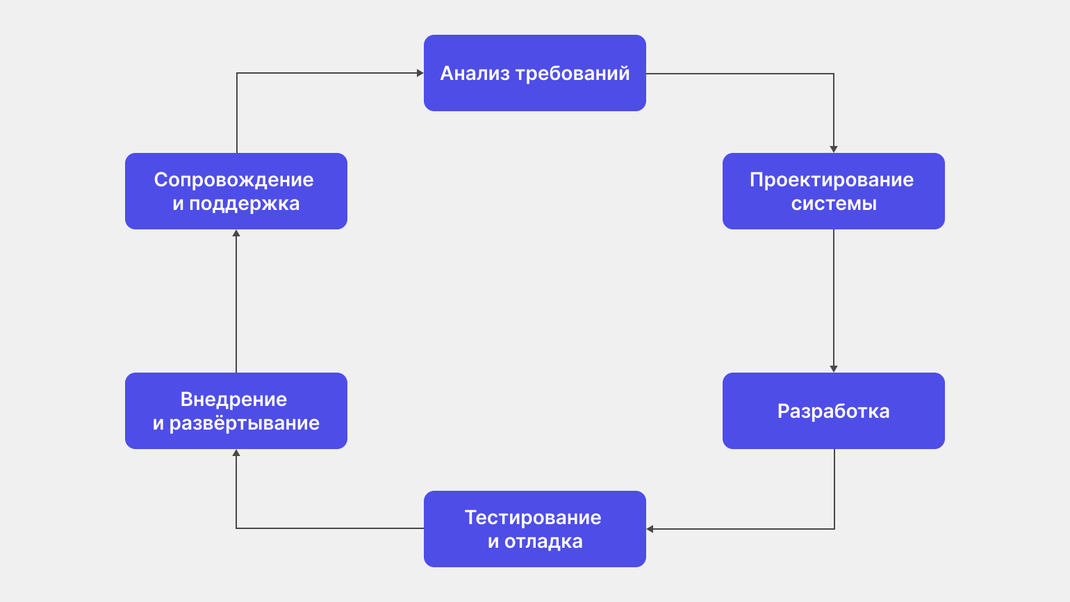 SDLC — это замкнутый цикл, в котором программный продукт проходит путь от концепции до готового решения. Например, разработка мобильного приложения для заказа еды начинается с анализа потребностей пользователей, затем переходит к проектированию интерфейса, программированию функциональности, тестированию и, наконец, публикации в App Store и Google Play. Далее мы немного подробнее рассмотрим каждый этап этого процесса.