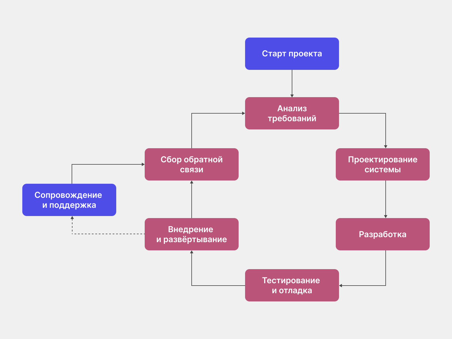 По сути, сопровождение — это не завершение, а продолжение цикла. Оно длится до тех пор, пока продукт поддерживается. На этом этапе команда собирает обратную связь от пользователей и бизнеса, выпускает новые версии и вносит изменения в код или инфраструктуру.