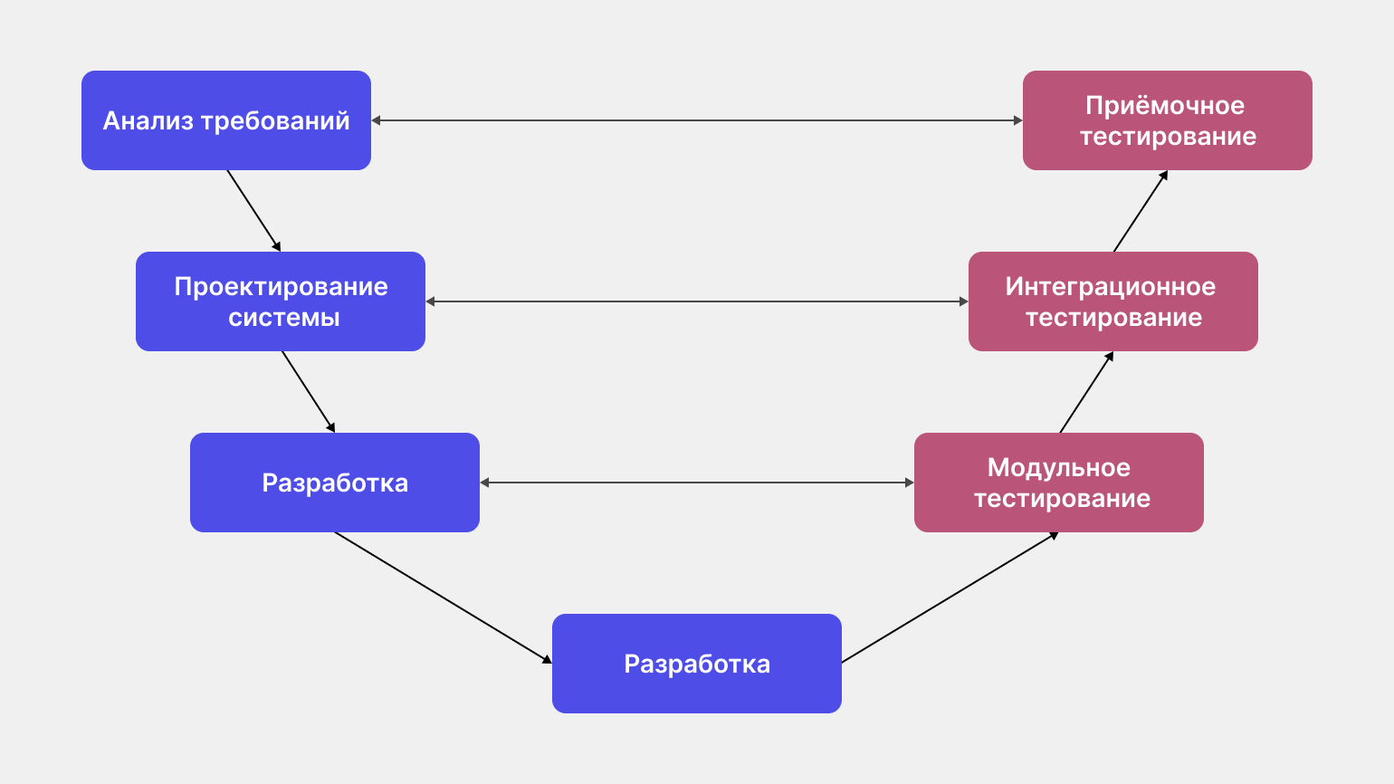 Каждый этап разработки на левой ветви связан с конкретным уровнем тестирования на правой: анализ требований — с приёмочным тестированием, проектирование архитектуры — с интеграционным, детальное проектирование — с системным, а написание кода — с модульным тестированием. Это позволяет контролировать соответствие функциональности исходным требованиям на каждом уровне и проверять исправность как отдельных модулей, так и системы в целом.