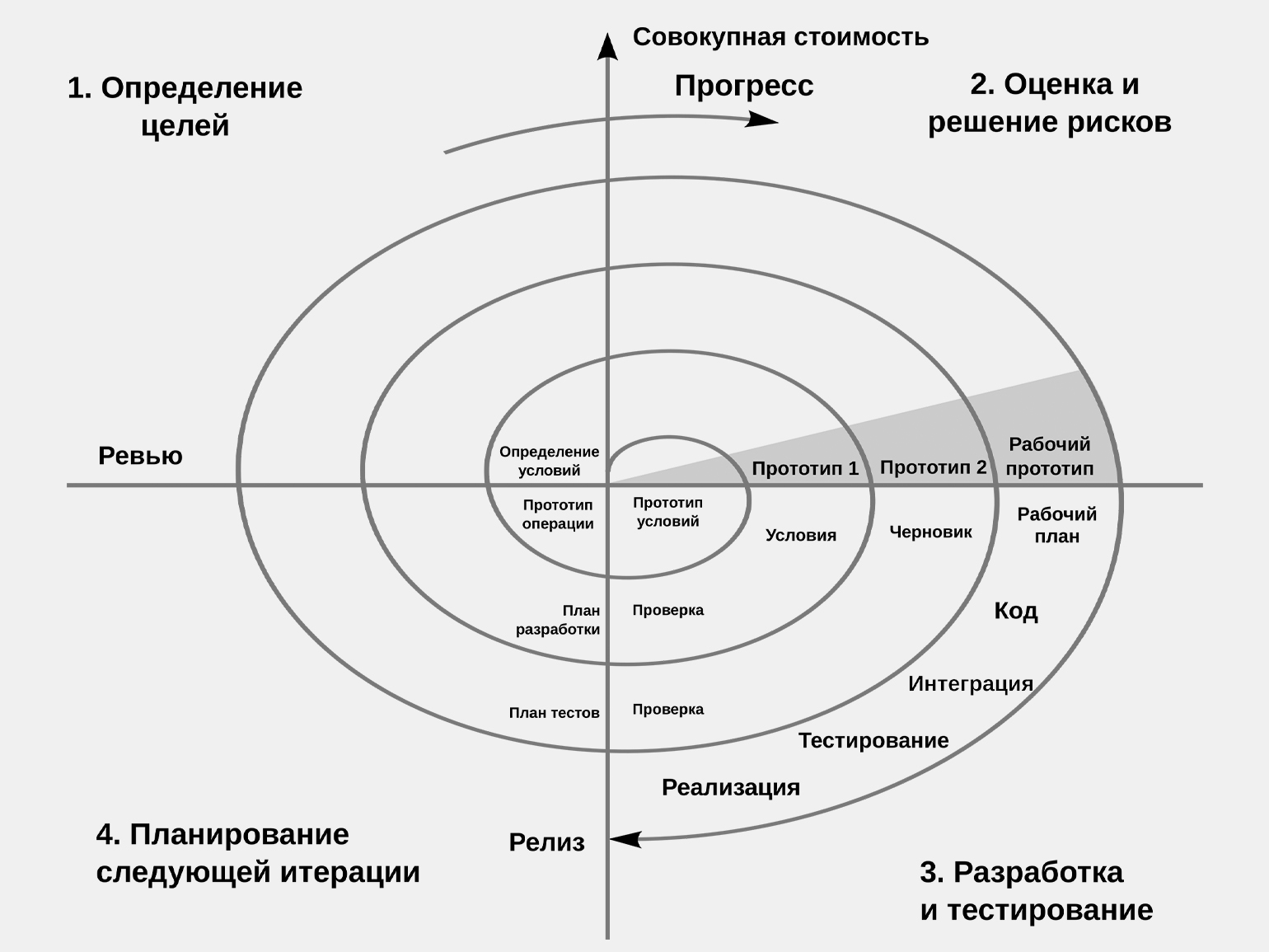 Боэм предложил концепцию спирали — цикла, в котором каждая итерация включает четыре фазы: определение целей, оценку и решение рисков, разработку и тестирование, планирование следующей итерации. При таком подходе продукт развивается в рамках серии изменений, каждая из которых приводит к появлению новой версии ПО.