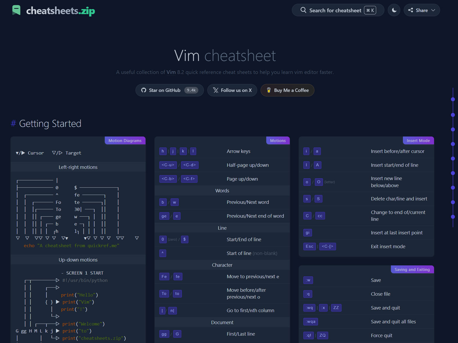 Огромная коллекция шпаргалок по разным языкам, фреймворкам и инструментам. Удобно, когда нужно быстро вспомнить синтаксис или редкую команду. Например, как наконец выйти из Vim.
