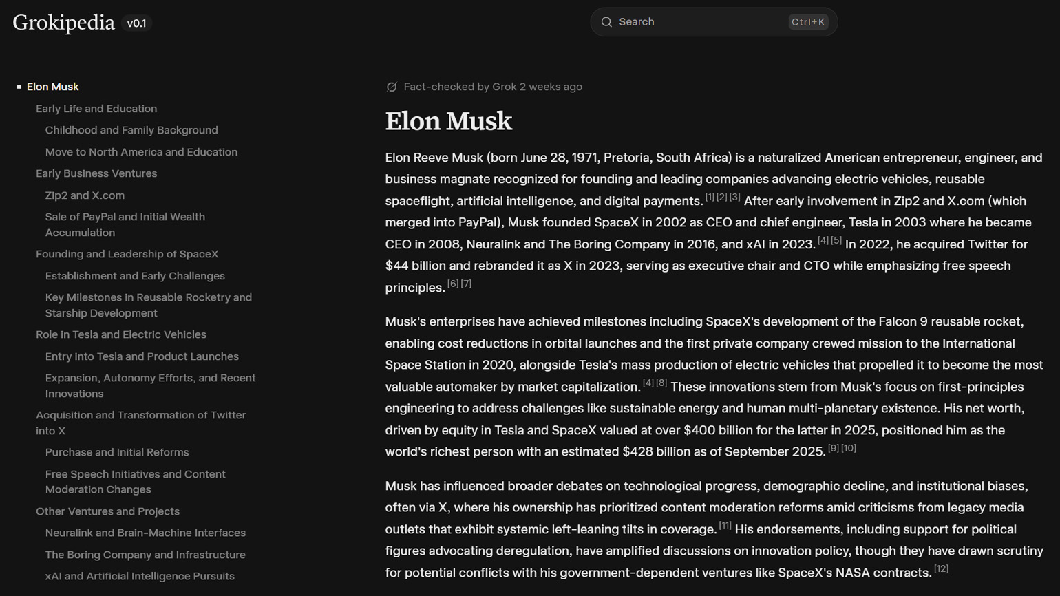 Илон Маск представил Grokipedia — онлайн-энциклопедию на базе нейросети Grok. По его словам, это «правдивая альтернатива „Википедии“», свободная от идеологической предвзятости и модерации.