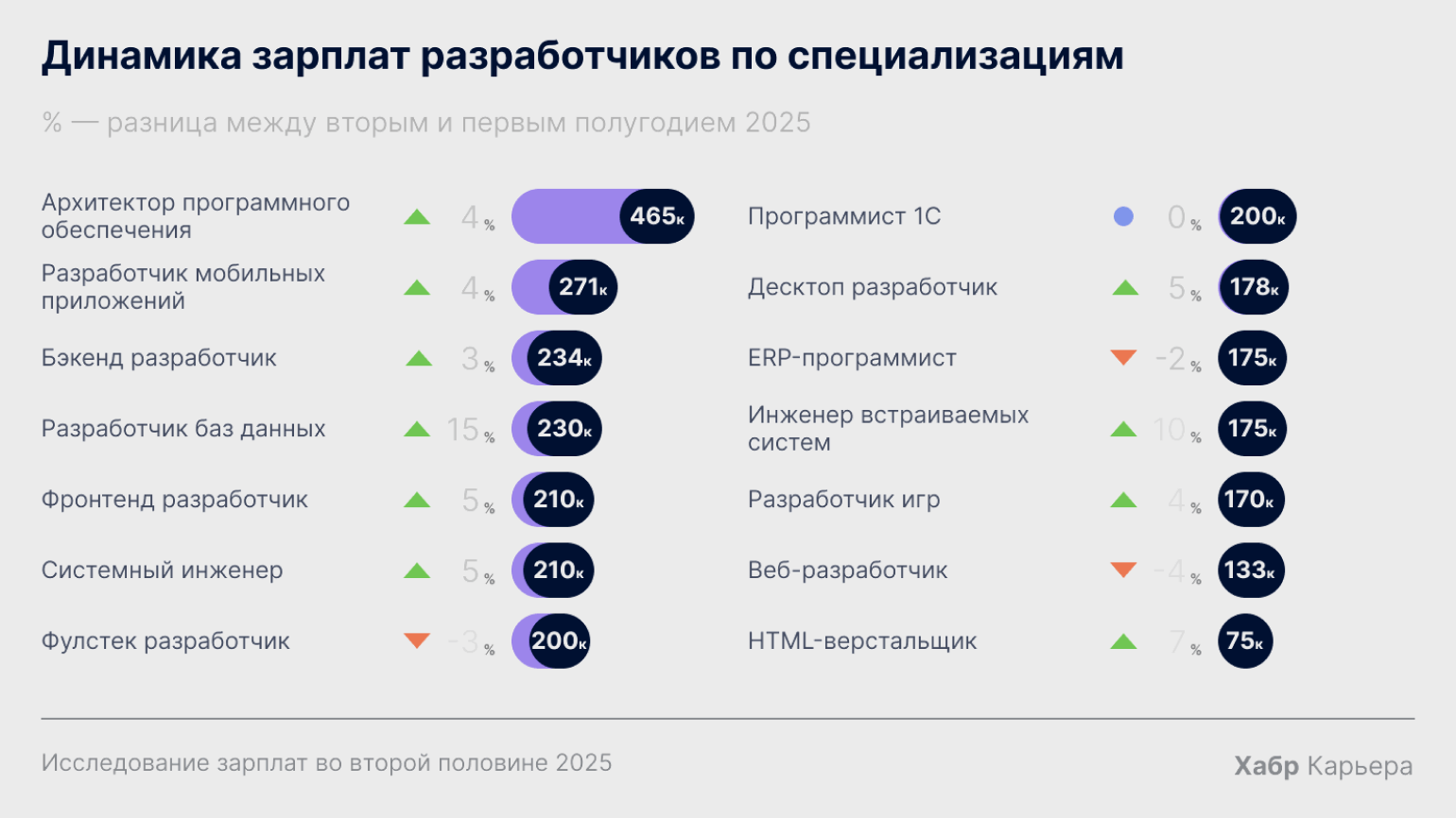 По данным исследования «Хабр Карьеры», уровень зарплат разработчиков сильно зависит от специализации. Больше всего получают архитекторы программного обеспечения: их медианная зарплата составляет 465 тысяч рублей. Это специалисты высшего уровня, которые проектируют структуру сложных IT-систем и принимают ключевые технические решения.